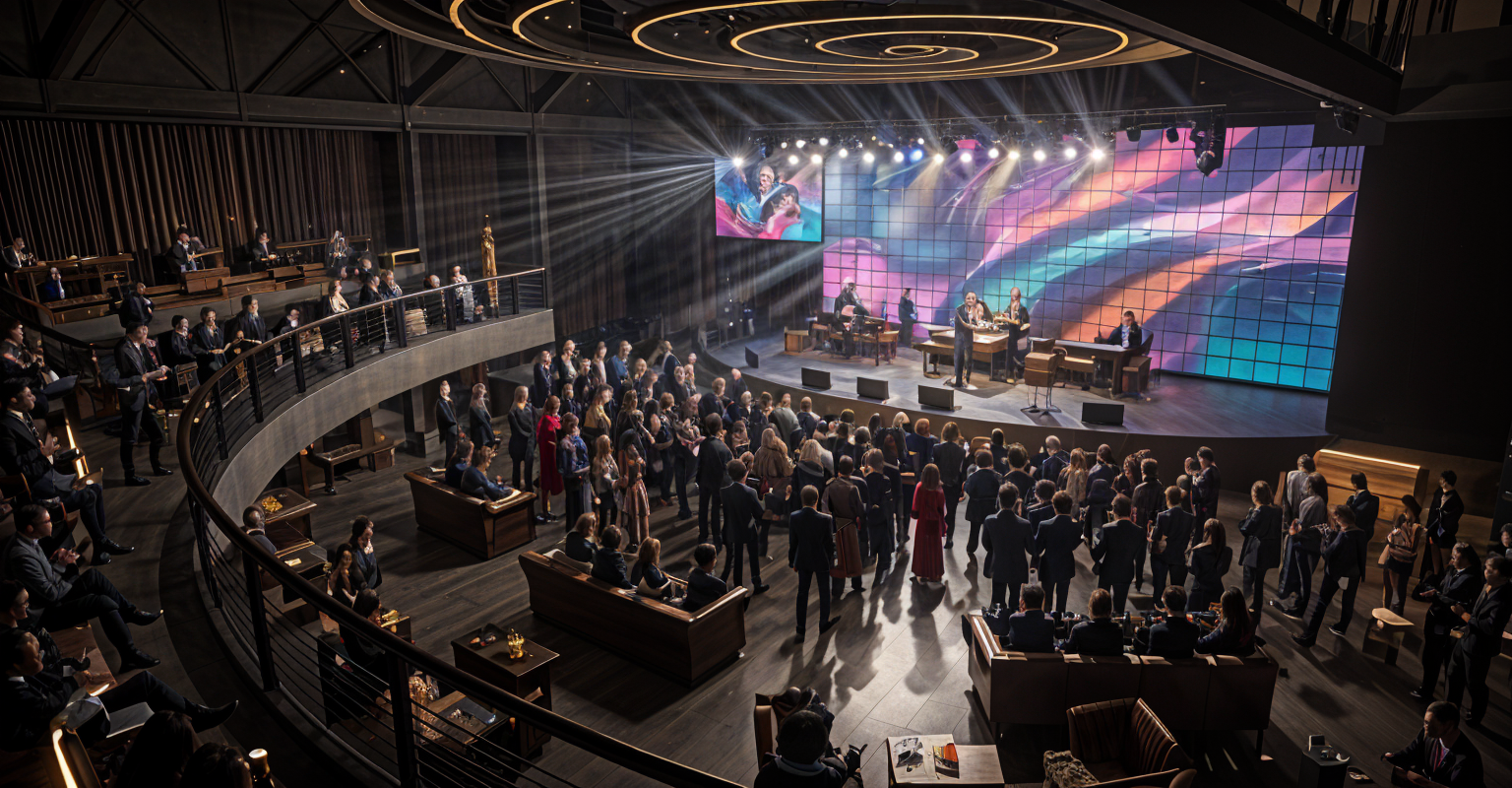 new urbanism perspective shot keep the exact camera angle distance and perspective from the supplied image do not move the camera or change focal length convert this scene into a photoreal upscale nightclub at night preserve the architecture exposed steel trusses balcony railings ceiling height stage shape wood fascia rigging positions and the single led wall do not change the geometry the audience area in front of the stage is a sunken dance floor that sits lower than the surrounding level the perimeter walkways and lounge platforms around it are higher preserve this elevation change do not flatten the floor levels add dramatic stage lighting with visible beams and subtle haze originating from the existing fixtures on the truss the single led wall should be slightly dimmer than the stage lighting display one unified abstract motion background clean and consistent no collage no text no logos no photos add a rectangular picture in picture imag overlay inside the led wall content as if routed through a switcher the led wall is the only screen do not add any other displays add upscale lounge seating with premium materials like leather velvet brushed metal and dark wood around the higher perimeter areas increase patron density patrons should face the stage and pay attention to the performers use polished concrete flooring with soft reflections lighting is warm and architectural mood is modern exclusive energetic concert ready architecture