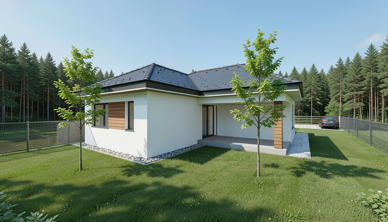 do not change the view keep model geometry the same windows doors roof walls pavement driveway fences facade decor sidewalk hyper realistic 8k cinematic lighting serene atmosphere photorealistic textures realistic reflections reference the current material style just enhance them only enhance the current materials and make the landscape nicer vegetation detailed textures in the wood siding and glass reflections and a vibrant clear sky with light atmospheric depth render in hyper realistic architectural visualization quality 8k resolution roof minimalist anthracite concrete tile facade a mix of smooth white mineral plaster horizontal walnut wood slats windows antracit aluminium minimal fence anthracite colored premium metal mesh landscape professional minimalist garden design green clean cut grass 2 young maple tree prunus laurocerasus whether nice clear early summer in middle europe outside the fence natural hungarian village do not add extra fence original fence is a 2 m high prunus laurocerasus fence