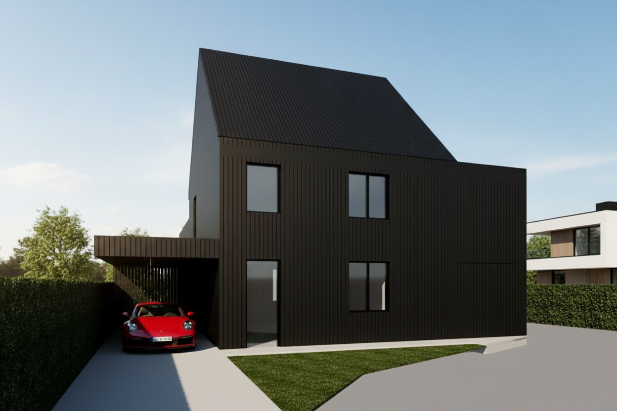 carlo scarpa exterior shot black roof and black wooden walls in the sommertime and a porsch in front under de carport without the house in the background architecture