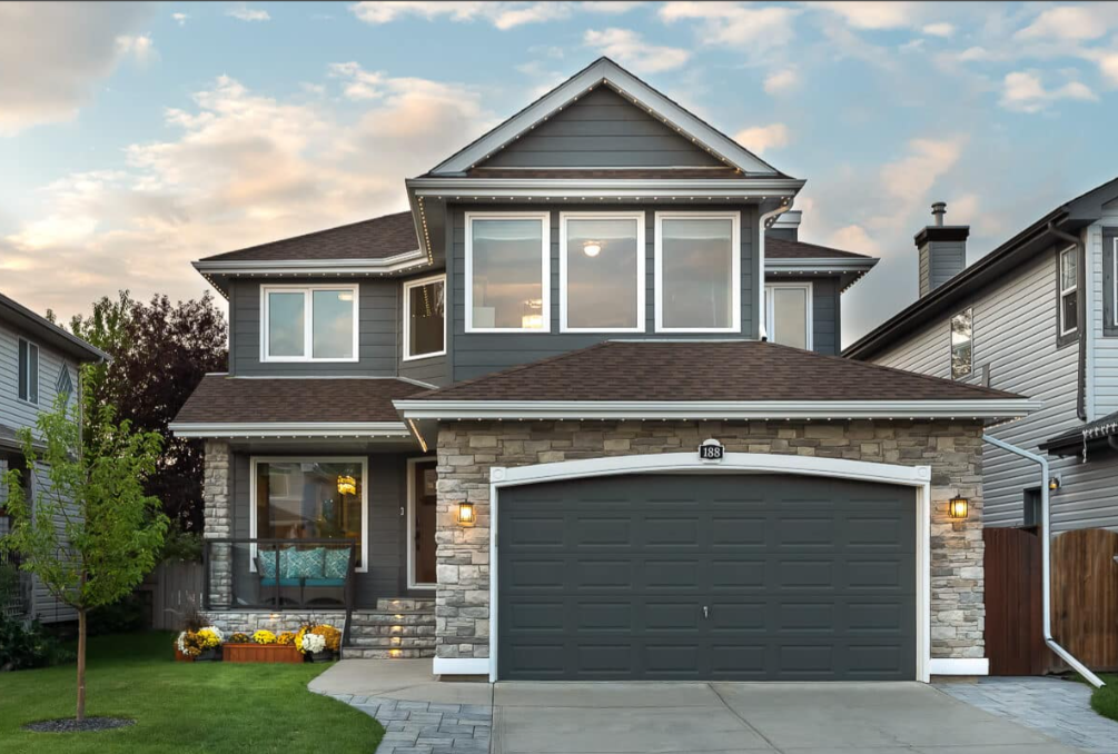 modernist interior shot older bc home exterior with wood lap siding painted in muted blue white window trim slightly weathered look surrounded by cedar trees cloudy sky realistic west coast atmosphere architecture