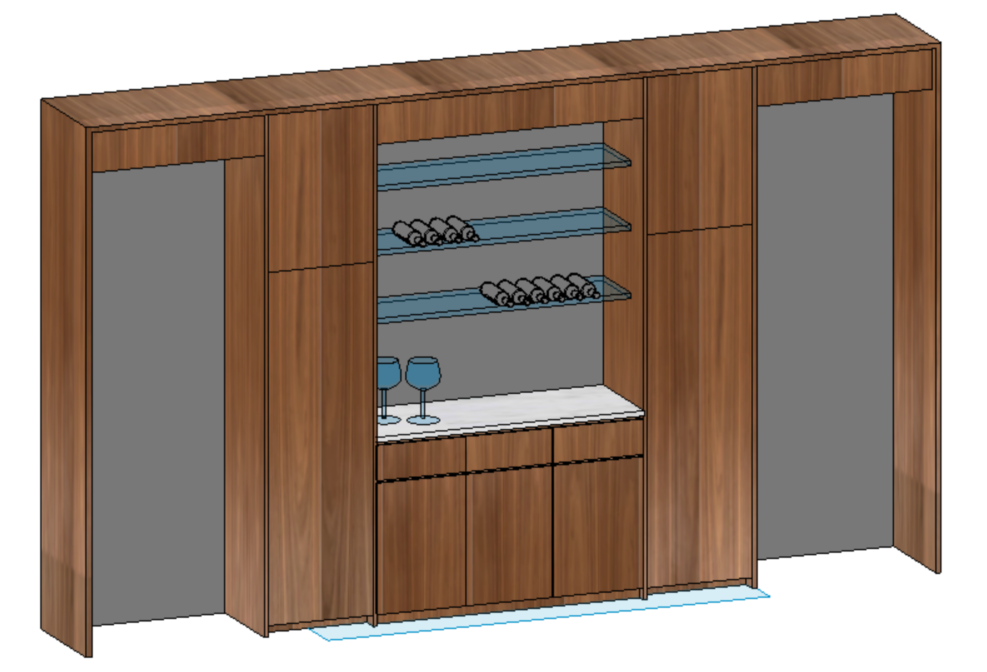 there s mirrors reflecting the ocean where the gray squares are the cabinetry is a warm shiny glossy walnut wood the shelves are clean glass with champagne glasses