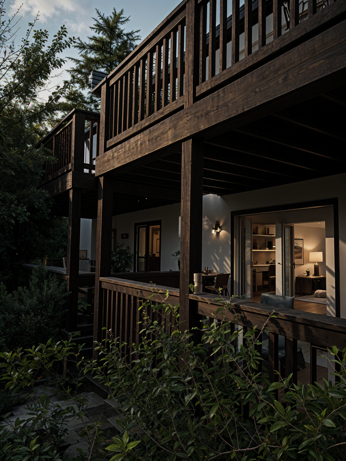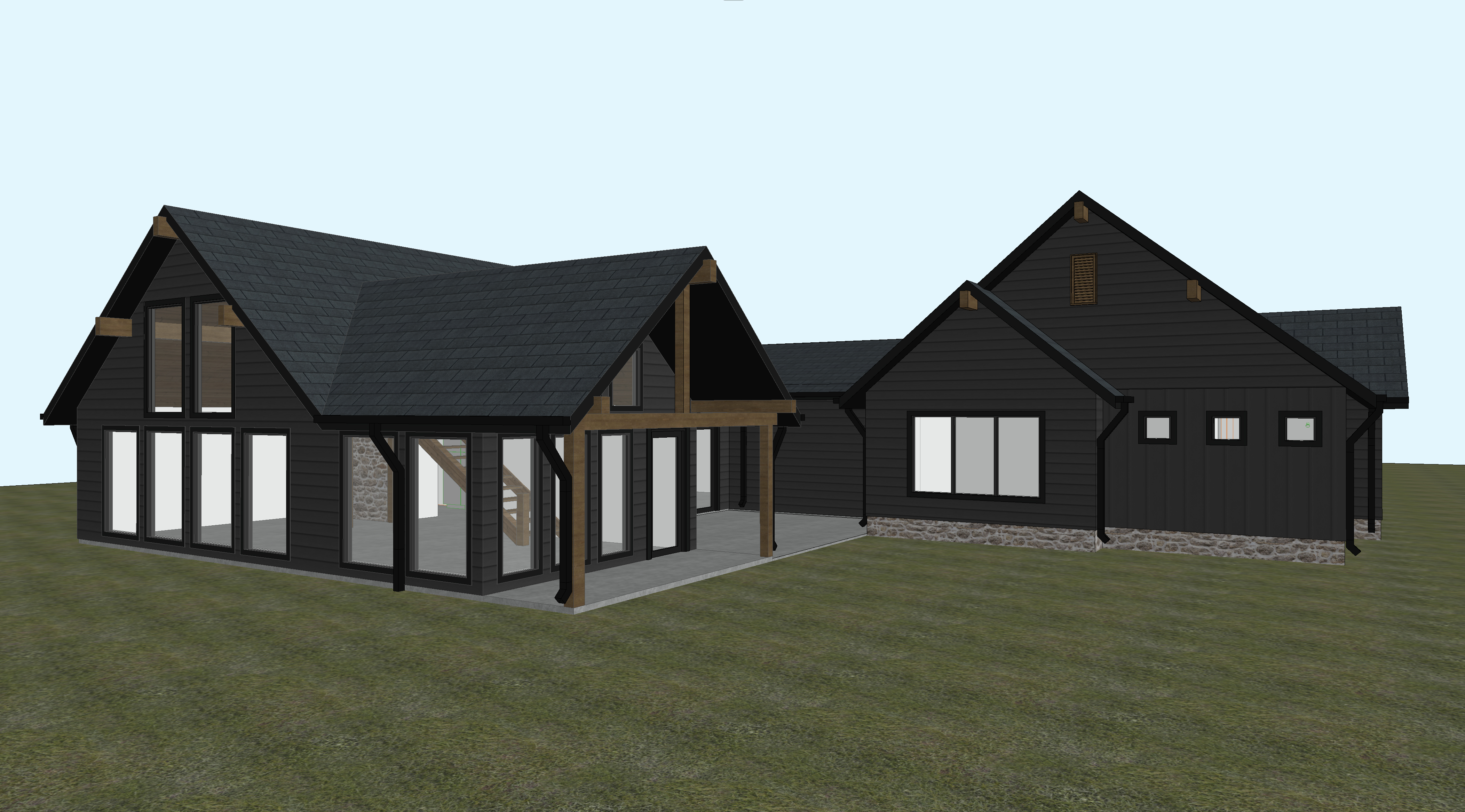 cottage with dark siding and roof with cedar accents stone retaining walls and floor beds with large ledge stones and flag stone path to front porch in the woods with a dry creek on the left side of the house in a ravine