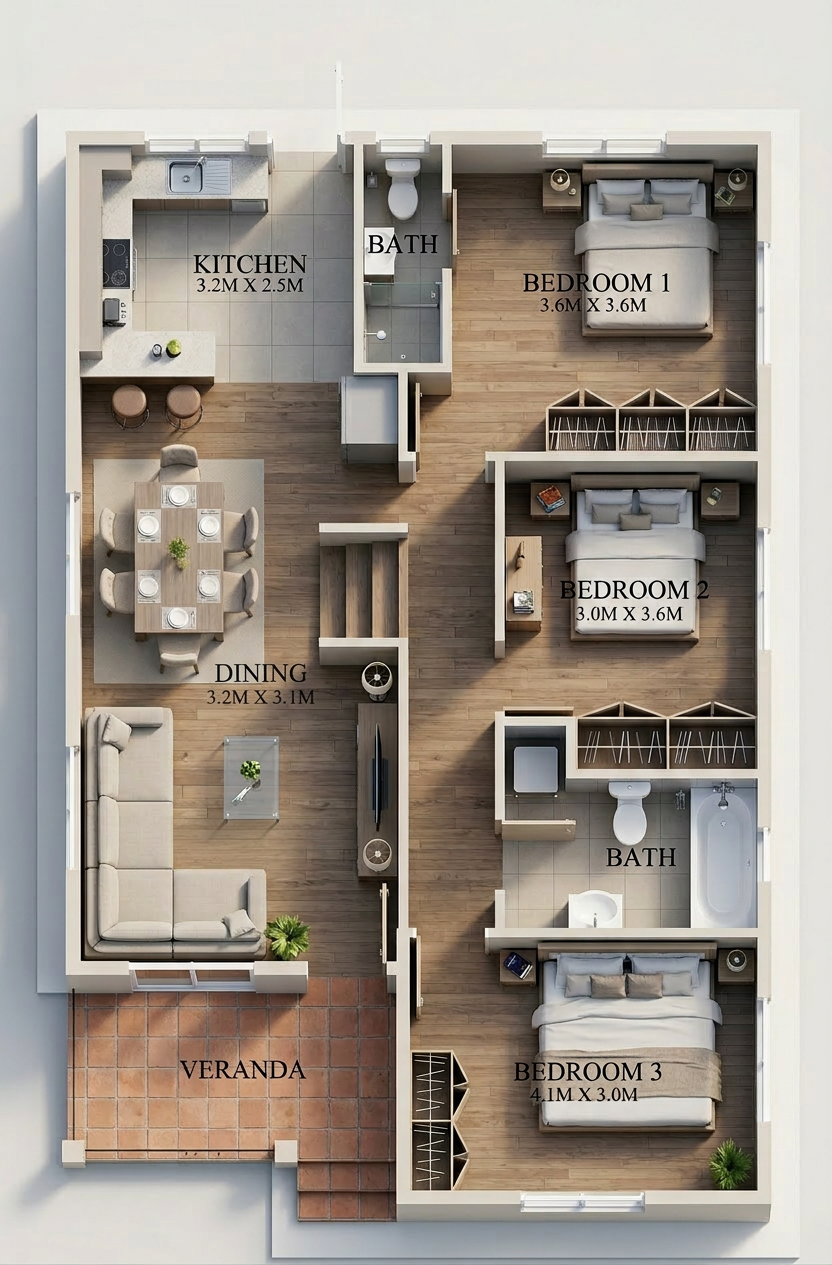 render a modern two story house with a clean and sleek aesthetic the exterior features a combination of natural wood that is light tan in color and dark charcoal gray siding the windows are large and framed with black accents providing a stark contrast to the walls the garage doors are dark gray with horizontal translucent panels surround the house with a lush green lawn and add some minimalistic landscaping use a clear blue sky as a backdrop with soft warm sunlight to create an inviting and serene atmosphere the overall mood is contemporary elegant and harmonious with nature
