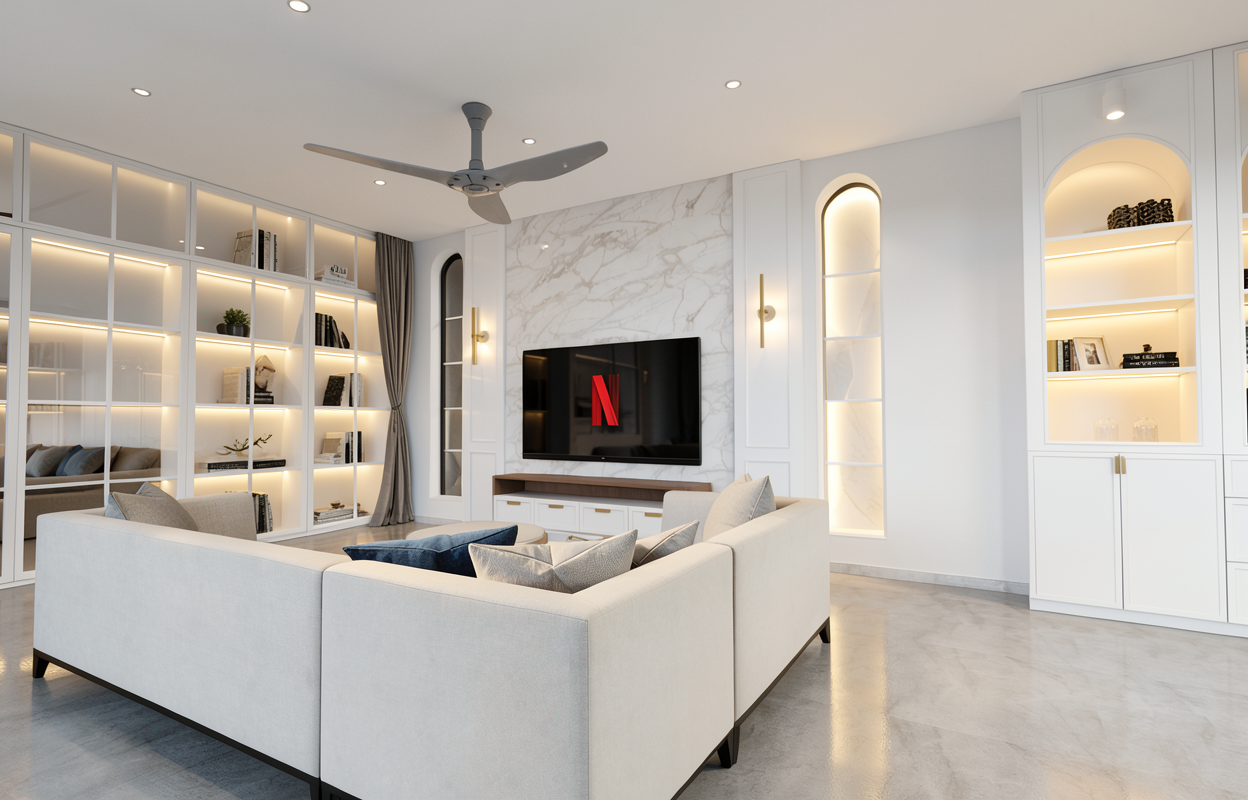 glossier floor decorated solid white bookshelf no need decorations for the rest add led lights inside the cabinets of bookshelf do not change the color of original feature wall 2 boards under the wall lamp is grey