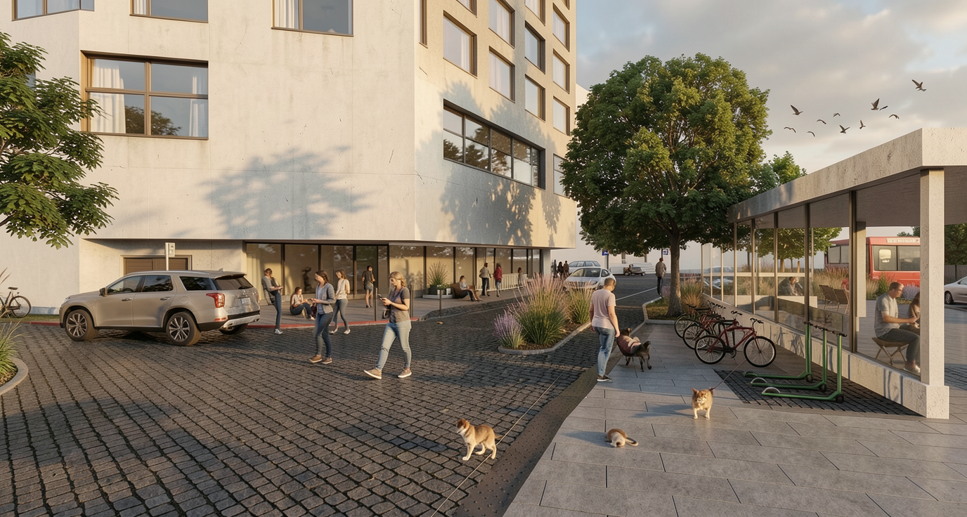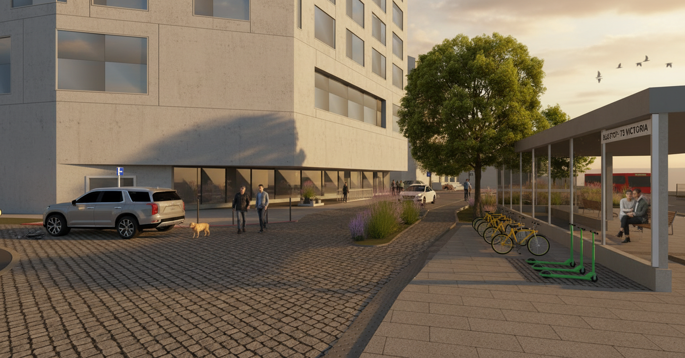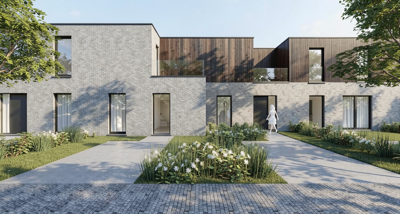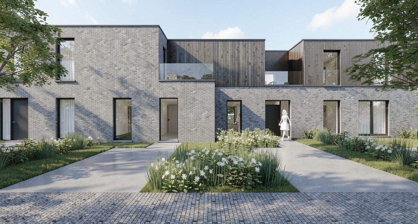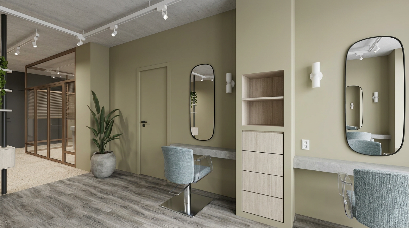 photorealistic interior render of a high end hair salon maintain exact spatial geometry and proportions of the uploaded 3d wireframe walls door door frame and built in shelving unit all finished in little greene portland stone deep muted olive beige shelves and drawers made of pava lavasteen monza light textured wood worktops under mirrors in light grey micro cement betoncire styling chairs upholstered in verotex barbuda pro 24 textured fabric with transparent acrylic plexi side panels and chrome bases left side glass partition with bronze metal frames flooring foreground therdex c15055 rustique light wood grey ish pvc flooring background beige fine grain terrazzo ceiling in light grey concrete look with white track lighting and white spotlights lights on the wall next to the mirrors in matte black left structural pole in matte black far left wall in little greene attic ii 144 dark grey soft even studio lighting no harsh shadows no sunlight streaks high quality architectural photography style 8k resolution ultra detailed textures