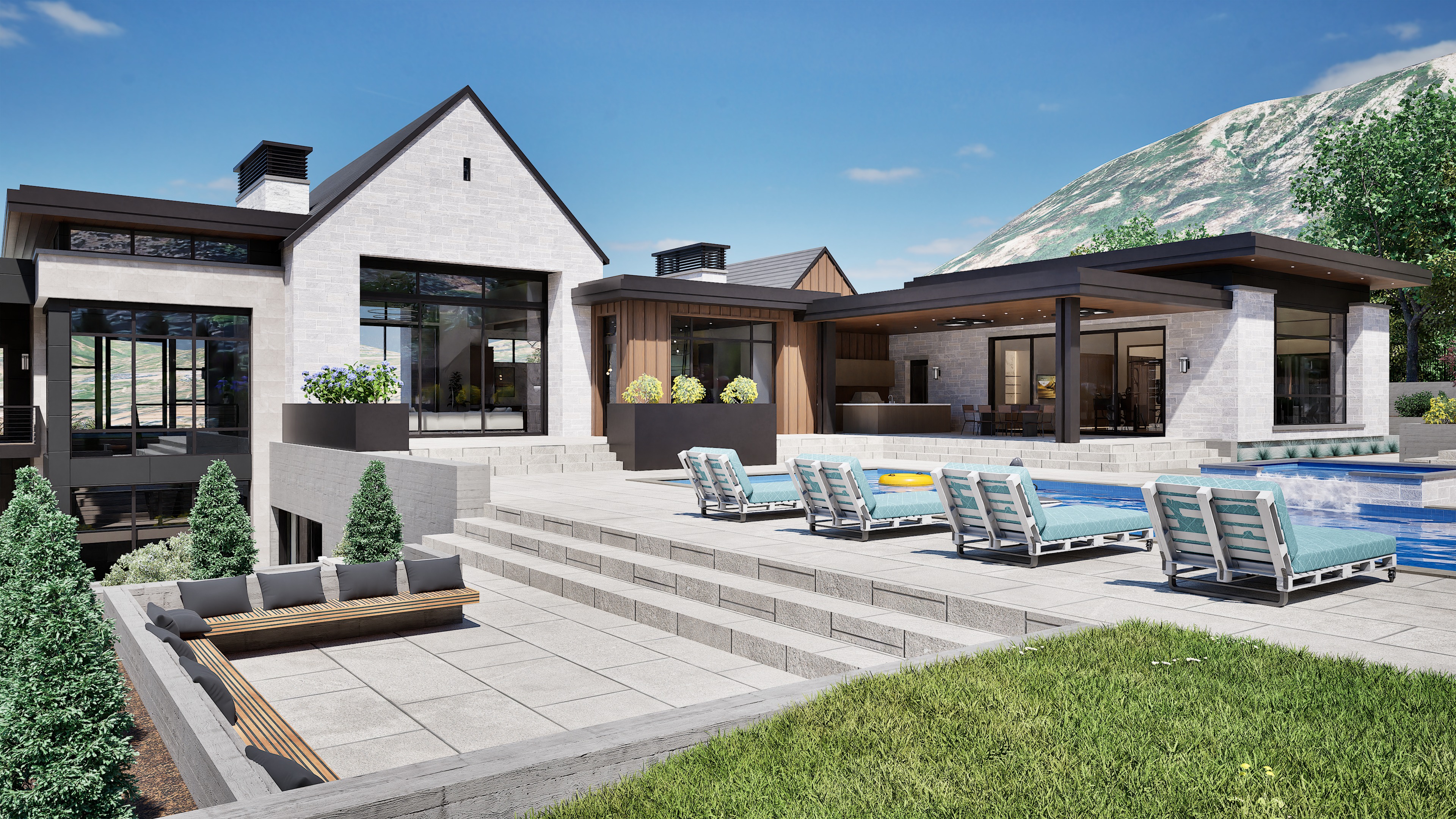 don t change the structure i want the environment to feel like a bright cool summer day with fluffy clouds in the sky change the pool chairs to be more realistic add a rectangle fire pit in front of the seats on the bottom left with fire add lights illuminating from the interior make the exterior materials feel realistic with better shadows and textures make the vegetation more realistic i want the image to feel photorealistic enhance background terrain to have enhanced trees bushes dirt and rocks