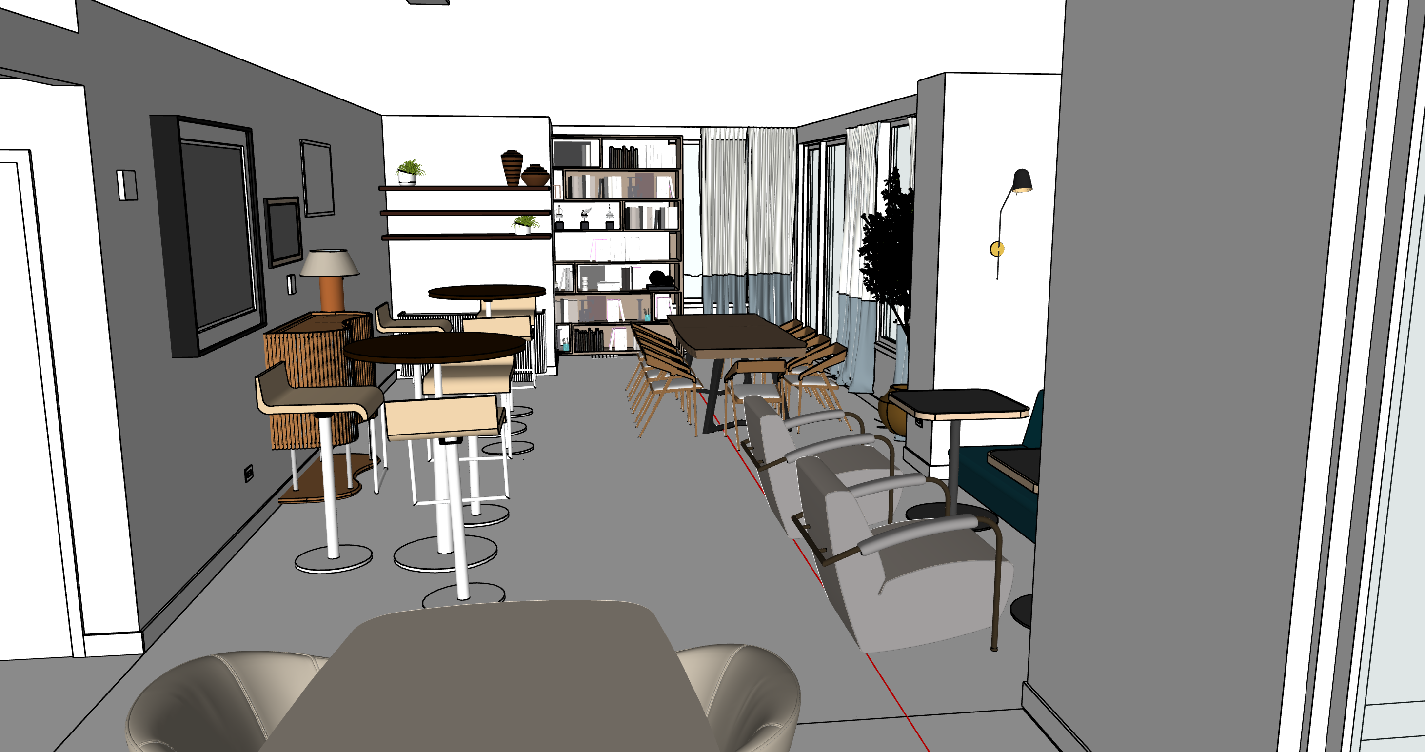 two by two coffered ceiling seamless horizontal wood oak flooring high bar stools and rectangular high tables in brass finish and plush green tactile upholstery hyper realistic details