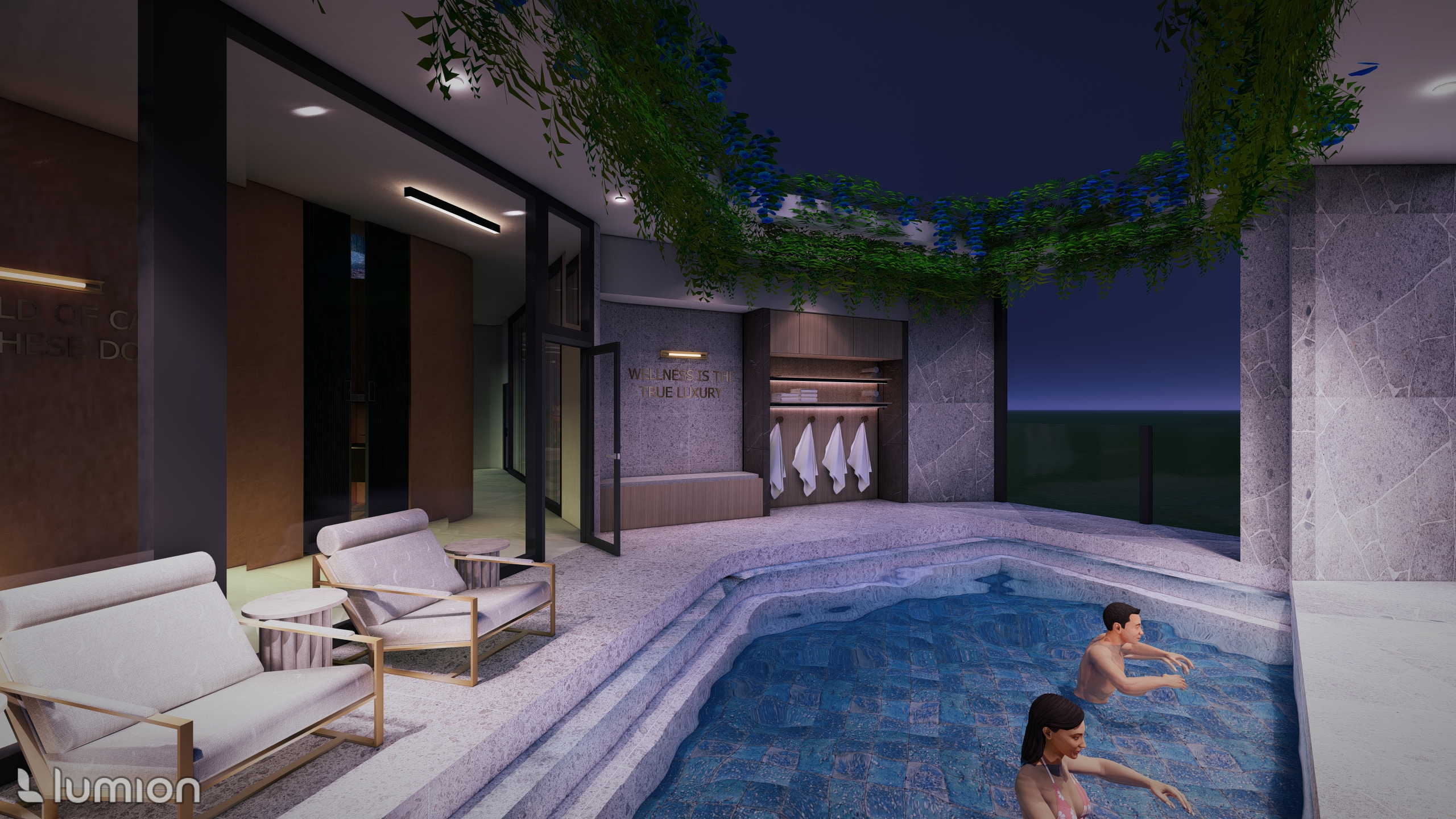 a refined outdoor heated pool terrace designed with soft curved stone edges and textured natural stone cladding on structural pillars two people enjoy the warm pool adding a relaxed lived in atmosphere a lush canopy of cascading greenery and vibrant blue flowers stretches across the overhead beams creating a sheltered biophilic environment along the right side plush lounge chairs with light fabric upholstery and gold frames line the walkway beside full height glass doors leading into the wellness interior the water surface has gentle ripples reflecting soft daylight beyond the terrace the background opens to a panoramic sydney skyline with distant towers framed against a bright open sky enhancing the sense of elevation and exclusivity the overall mood is tranquil luxurious and spa like rendered in a high end lumion visualization style with smooth lighting and detailed textures