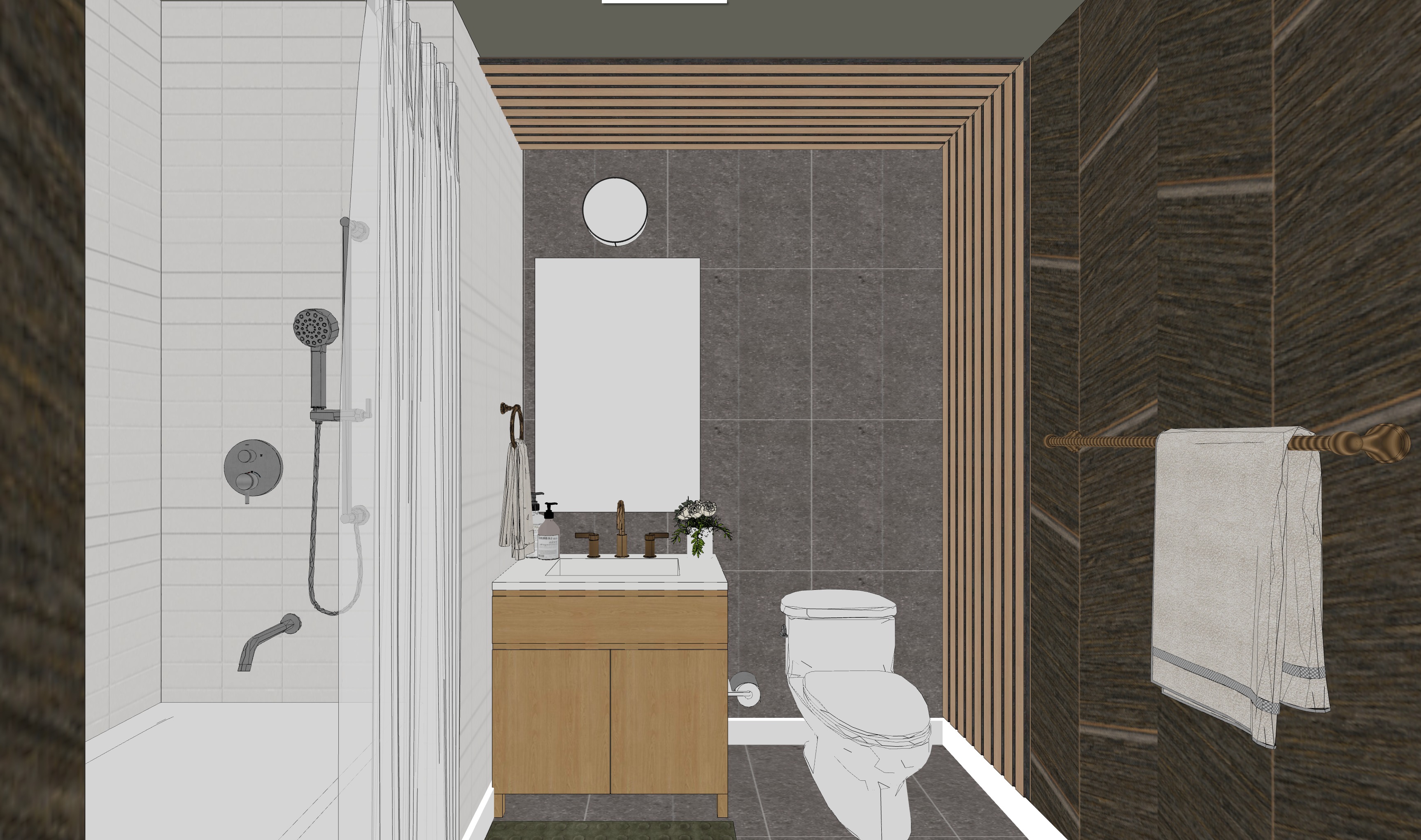 render exactly as is in the sketch that is a mirror over the vanity there is no sun in this room turn sun off this is good make the room a little brighter