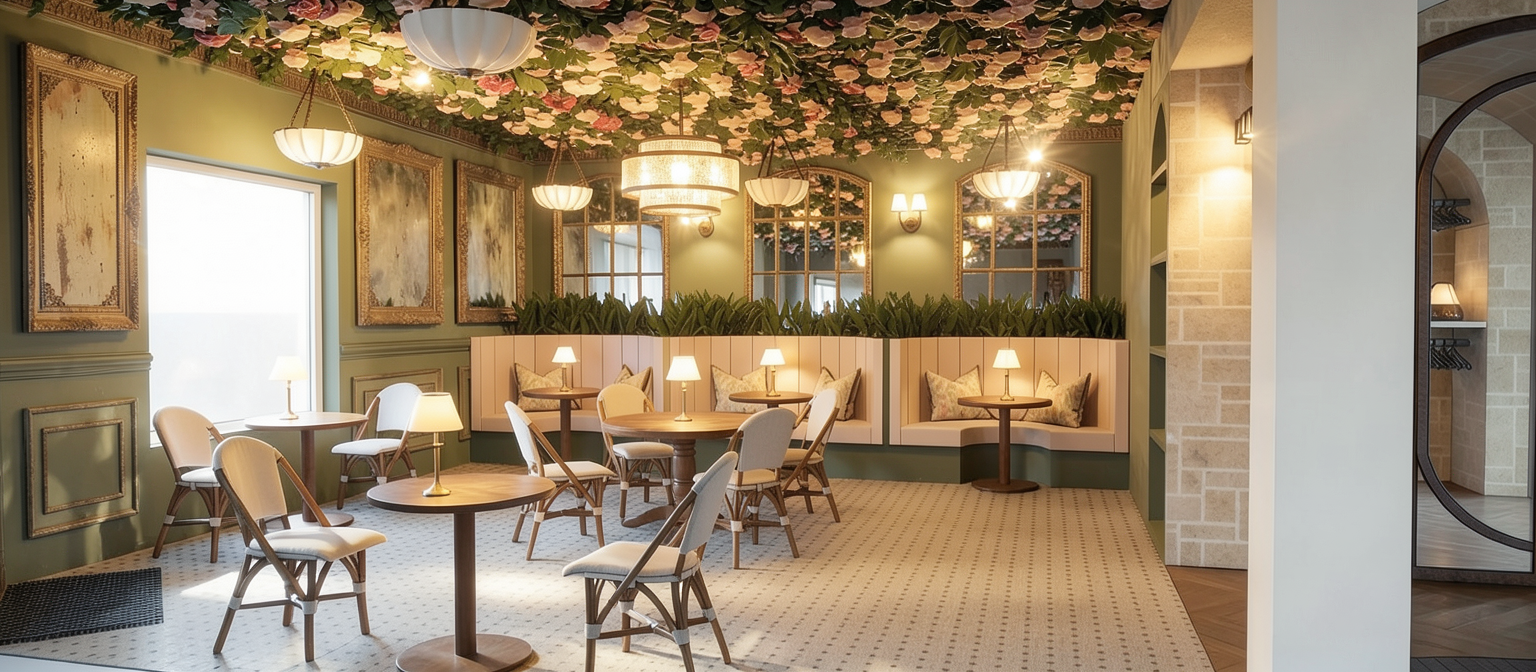 keep the colors shapes and textures the same the mirors on the back wall should be antique looking the ceiling is covered in real flowers turn on the light fixtures and make it a bright yet moody ambiance the antique mirrors are only on the back wall the right wall has moulding