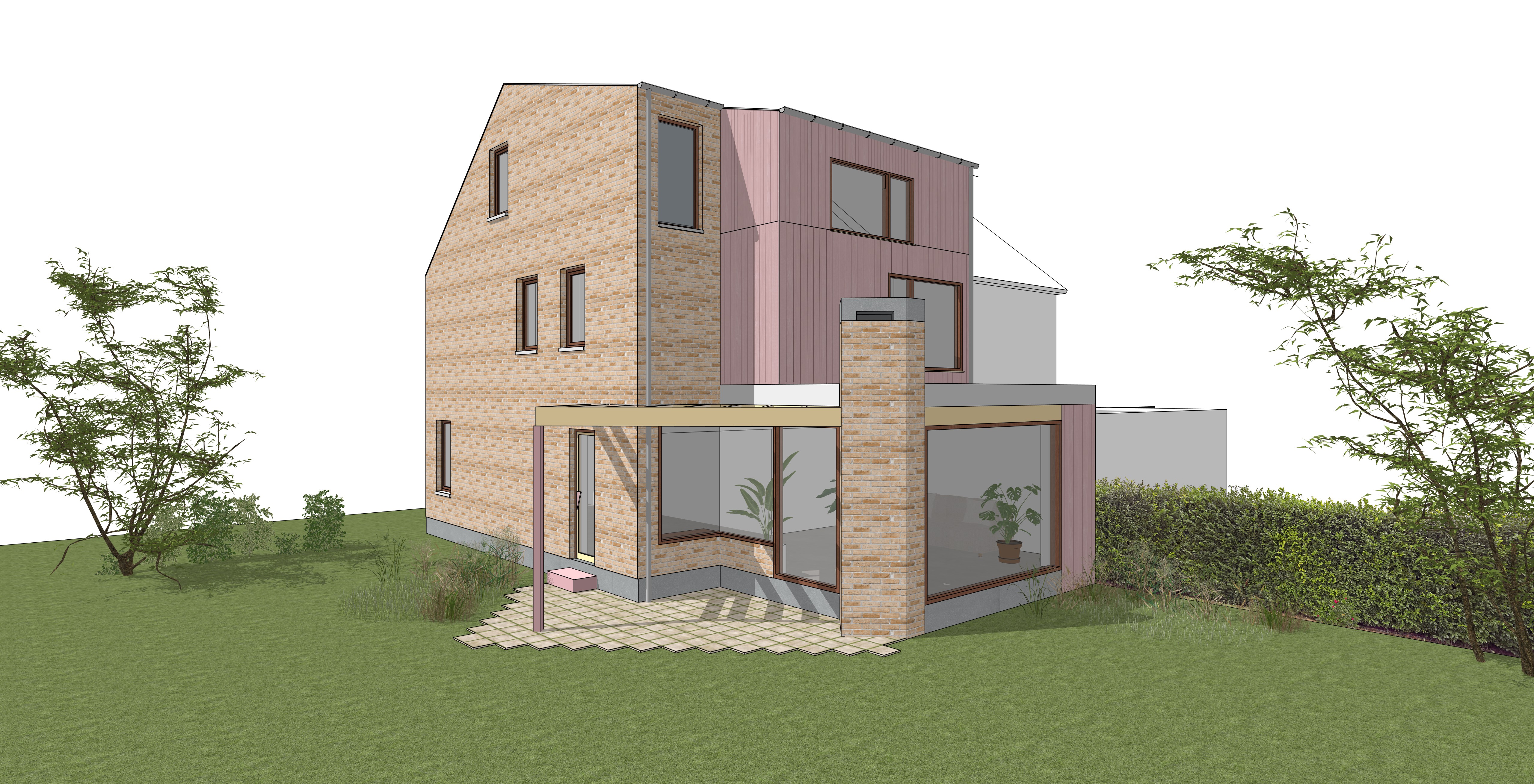 een hyperrealistische architectuurfoto van deze tekening daglicht zacht ochtend of namiddaglicht dat textuur en diepte benadrukt camera architectuurfotografie stijl 35 mm pbr materialen ultra realistische texturen hoofdvolume in geel oranje genuanceerde baksteen aanbouw in roze houten gevelbekleding subtiel kleur luifel in het zacht geel grijze boord erboven is spiegel veel glas donkerbruine ramen en deuren wilde tuin