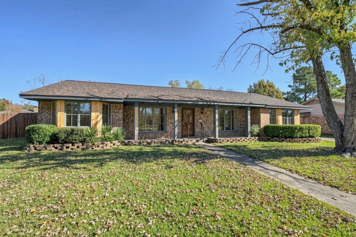 change the landscaping to a cottage garden with a mix of shrubs and flowers and add flowering crabapple trees on each end of the house