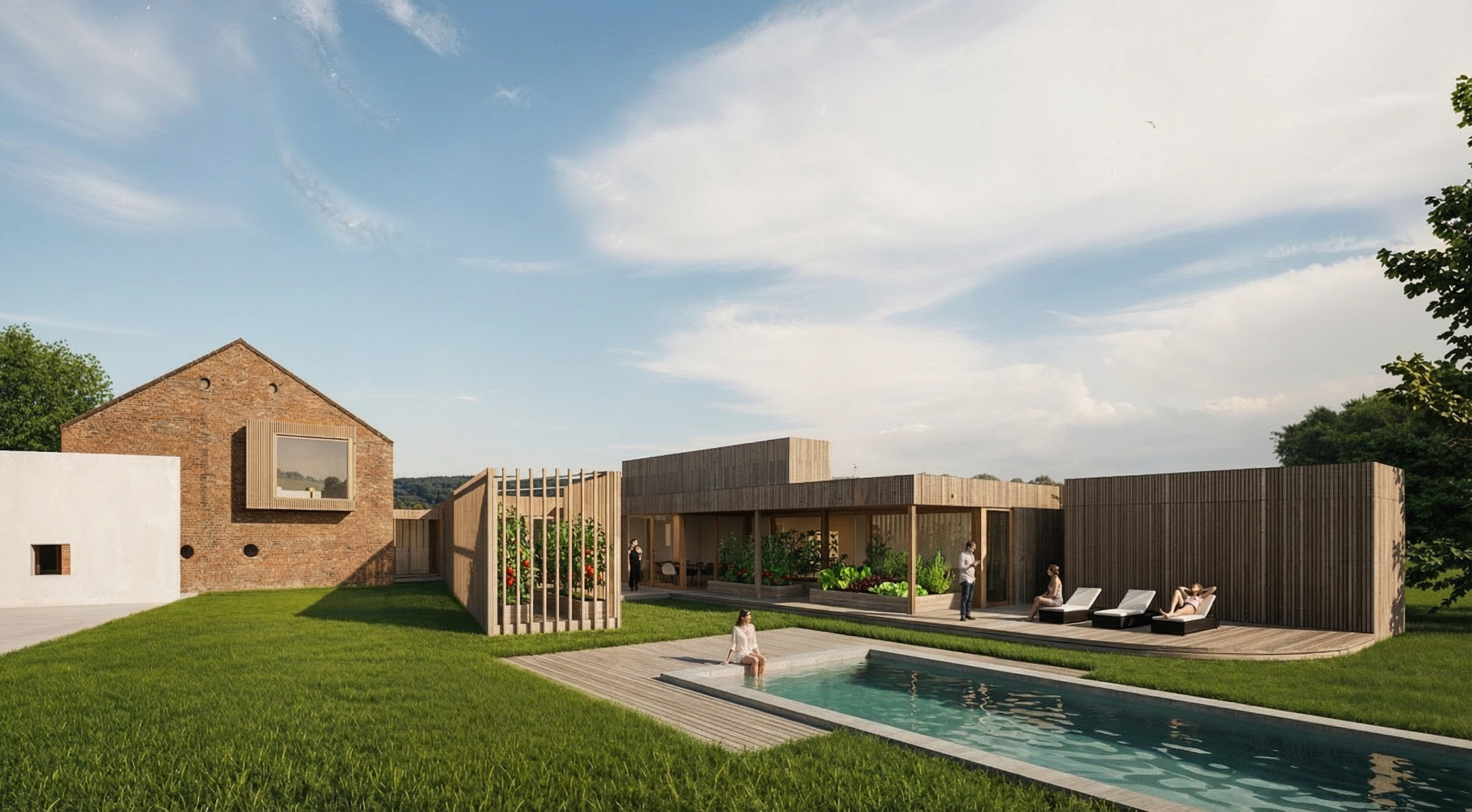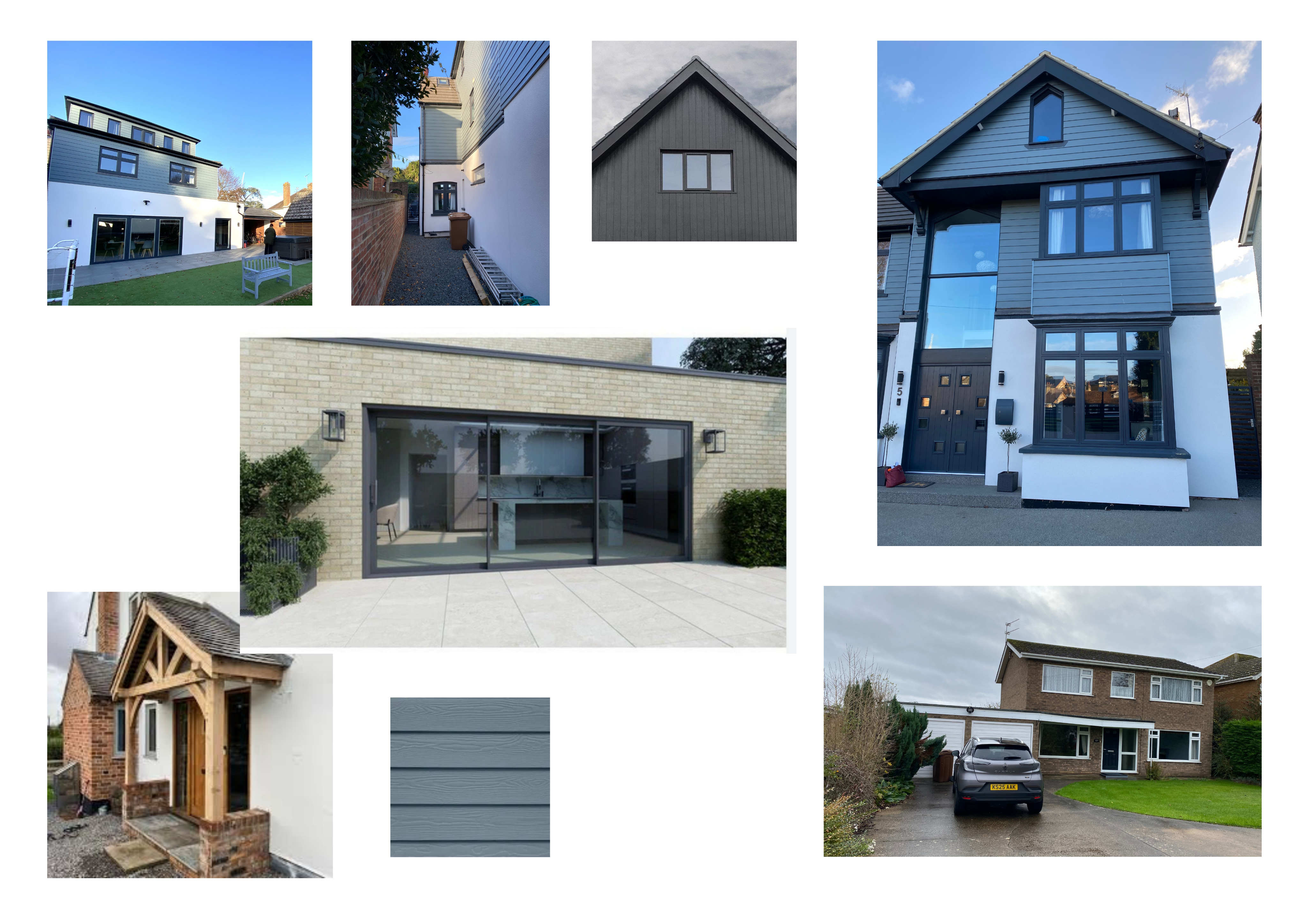 exterior shot first floor projection ocean blue vertical cladding flat roof single storey extension white render dark grey windows brick elsewhere