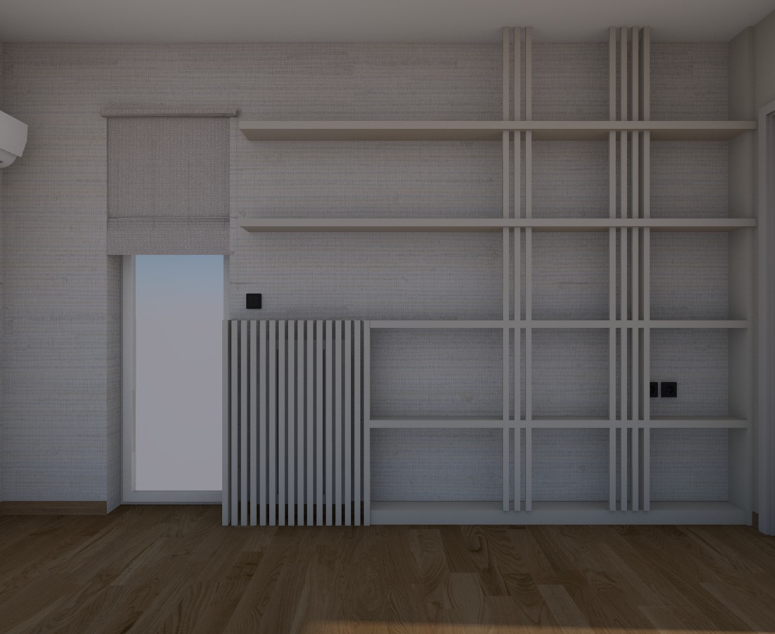 there is a shelve unit realistic view calm minimal styling just four books the view off the window is white