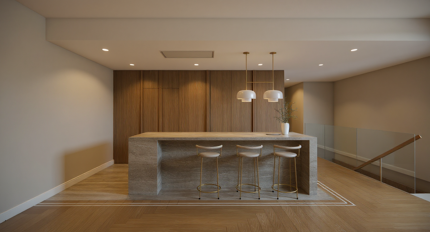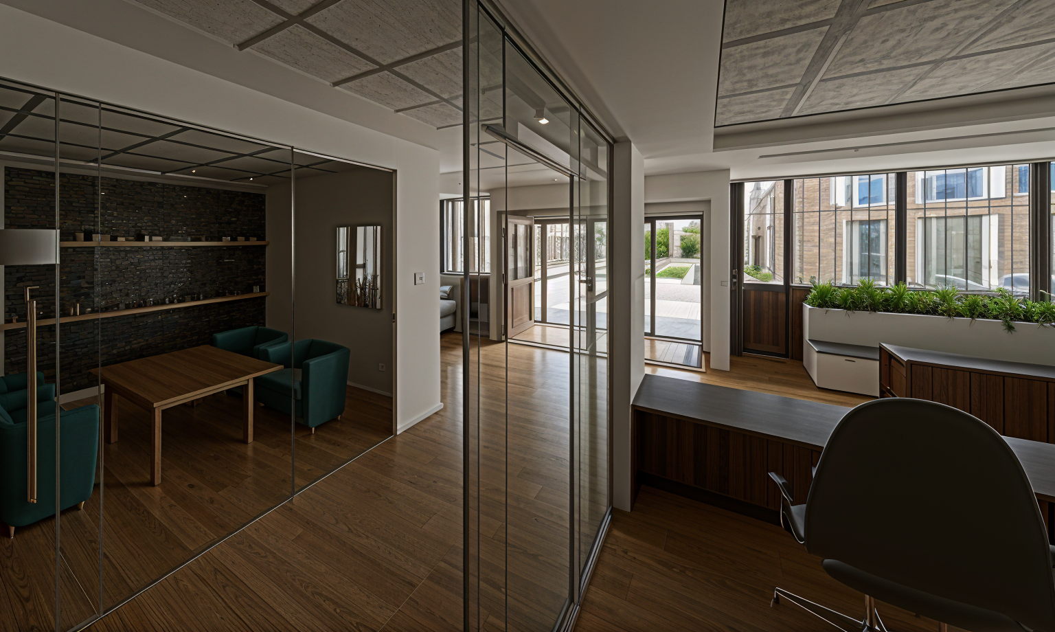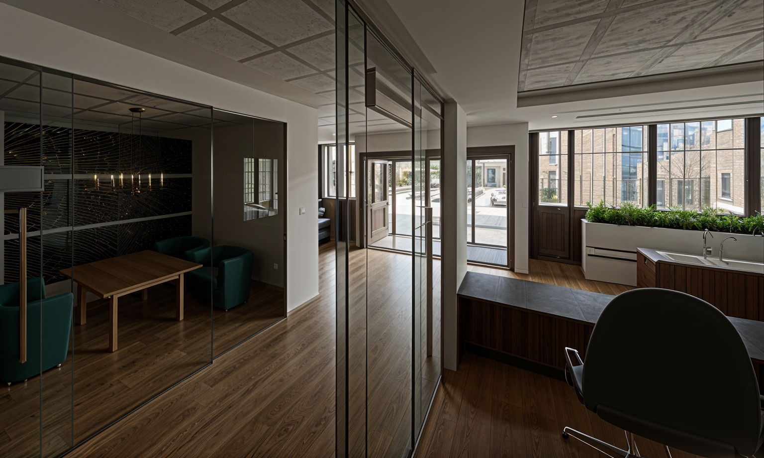a modern office interior with a focus on sleek and elegant design well lit by natural sunlight streaming through large windows the atmosphere is professional yet inviting featuring glass partitions for a spacious feel the walls are a soft cream color complemented by rich dark wood furniture the chairs are upholstered in a deep teal fabric adding a pop of color a contemporary light fixture hangs overhead casting a warm glow the floor is a light maple wood enhancing the airy ambiance a vibrant abstract art piece in gold and black adorns one wall adding sophistication and visual interest lush green plants near the window bring a touch of nature indoors