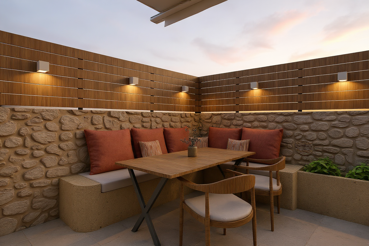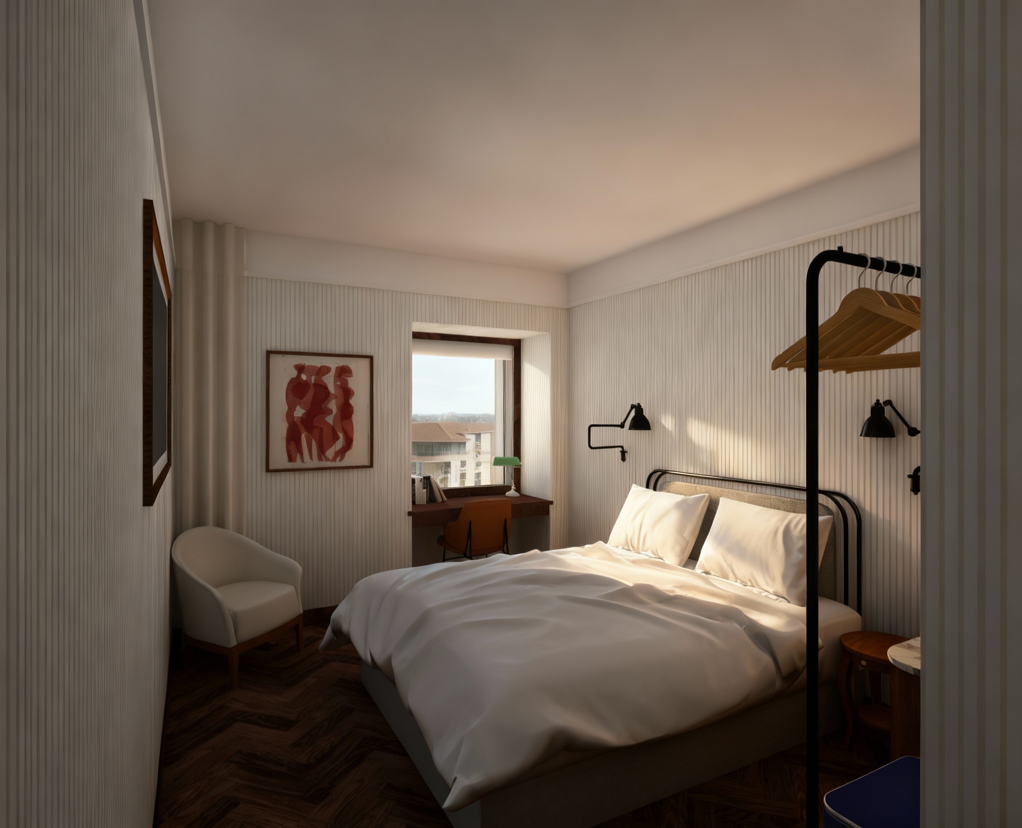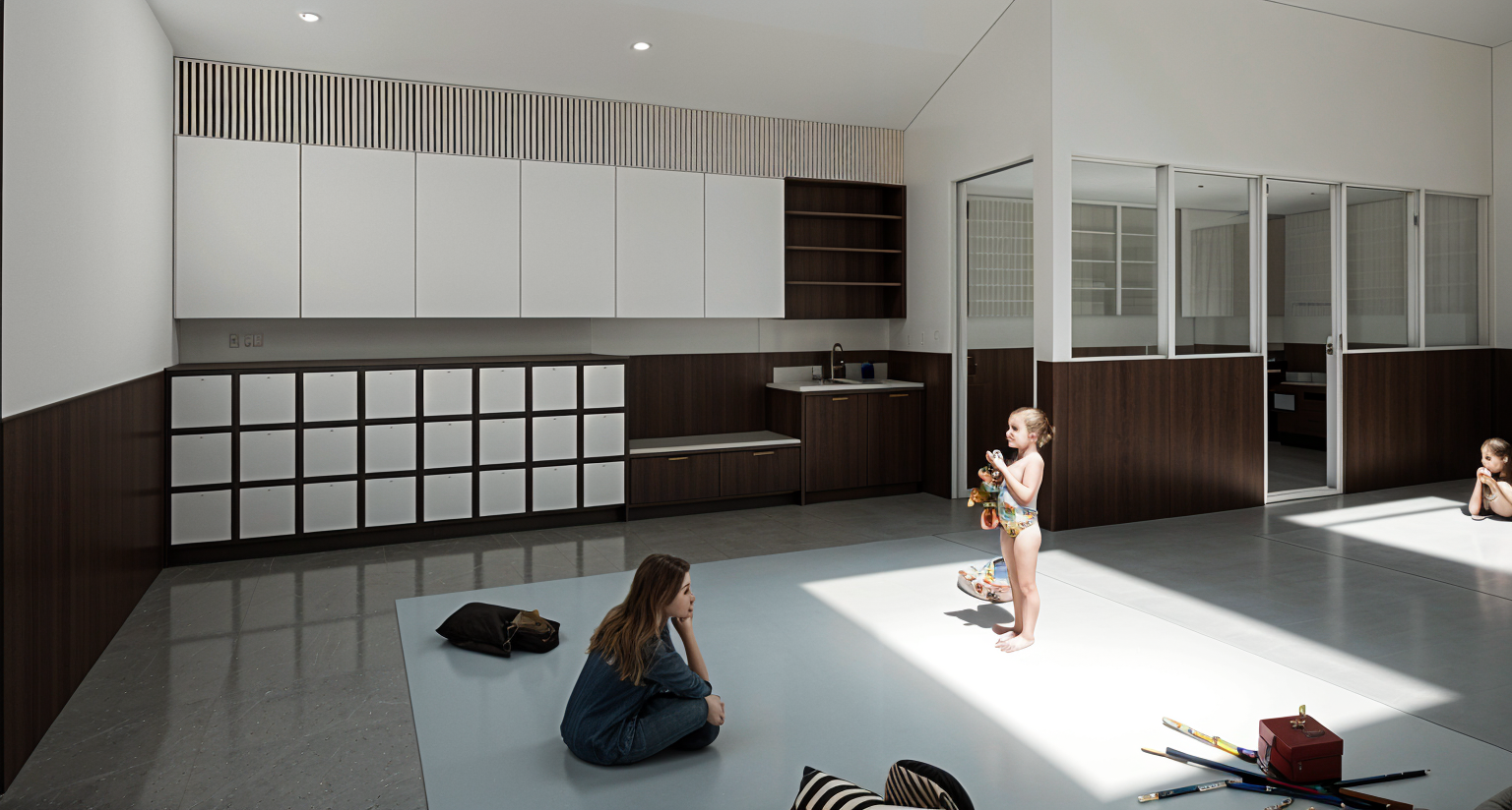 a modern office interior with a focus on sleek and elegant design well lit by natural sunlight streaming through large windows the atmosphere is professional yet inviting featuring glass partitions for a spacious feel the walls are a soft cream color complemented by rich dark wood furniture the chairs are upholstered in a deep teal fabric adding a pop of color a contemporary light fixture hangs overhead casting a warm glow the floor is a light maple wood enhancing the airy ambiance a vibrant abstract art piece in gold and black adorns one wall adding sophistication and visual interest lush green plants near the window bring a touch of nature indoors