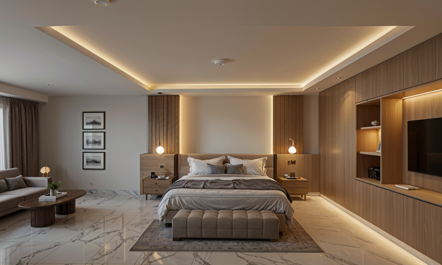 create a luxurious modern bedroom interior the walls are adorned with soft white finish enhancing a minimalist aesthetic the bed is dressed in silky white linens with gray accent pillows and a charcoal throw the panel behind the tv has a concrete texture with vertical grout lines a cozy soft beige lounge sofa complements the dark wooden coffee table below adorned with magazines and a small green plant the flooring is a polished white marble tile reflecting subtle lighting from the sophisticated white ceiling design which includes recessed lights and a soft glow along the edges the atmosphere is serene and elegant with a hint of modern sophistication ideal for relaxation and tranquility