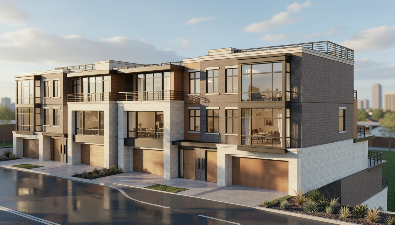 ltra photorealistic architectural rendering in a cinematic real time visualization style unreal engine d5 render quality late morning daylight with slightly angled sun creating soft defined shadows balanced exposure with no blown highlights low bloom and controlled dynamic range warm neutral color grading with subtle warm highlights and neutral shadows no blue tint natural material response with warm light reflecting off wood and ground surfaces slight contrast boost with clean crisp edges and subtle ambient occlusion clear atmosphere with no fog or haze but natural depth created through slight background softening and contrast falloff foreground and main subject remain sharp and detailed minimal curated landscaping with natural but slightly desaturated greenery no overgrown vegetation cinematic composition realistic sky with soft blue tones and light clouds professional architectural visualization style sharp focus 8k resolution lit and fully furnished interiors behind windows road with driveways to garages in foreground city of cincinnati ohio in background base of structure built into downward sloping green hillside
