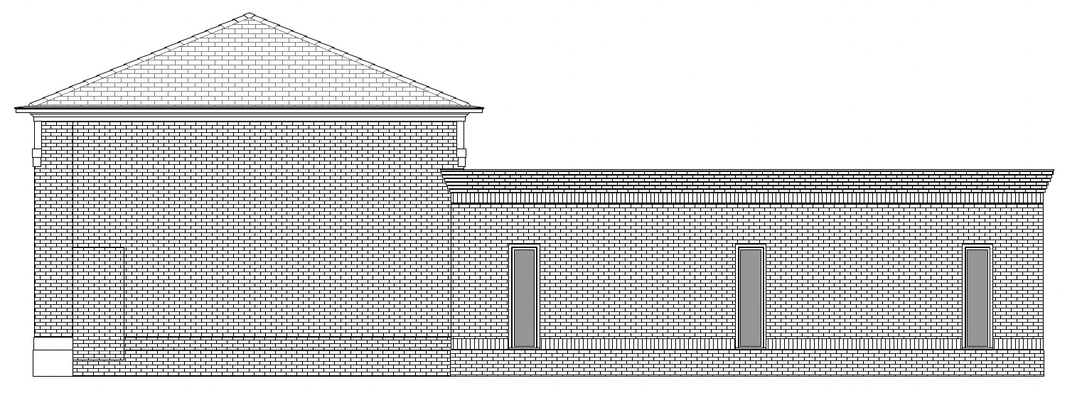 brick building with stucco entablature on left stepped brick parapet on rights with frosted windows on right addition only painted white trim