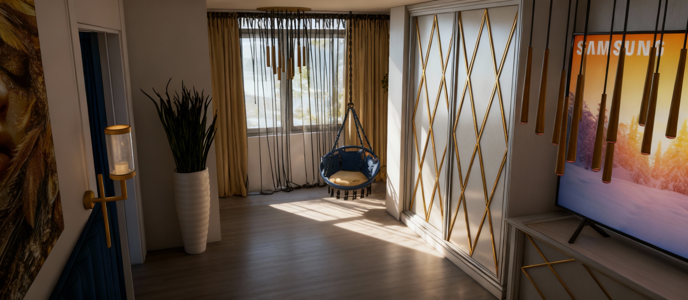 this lamp has to be in a corner of a moderne appartment with marbke it has to be next to a big modern sofa and a plant with a nice view trough the window architecture