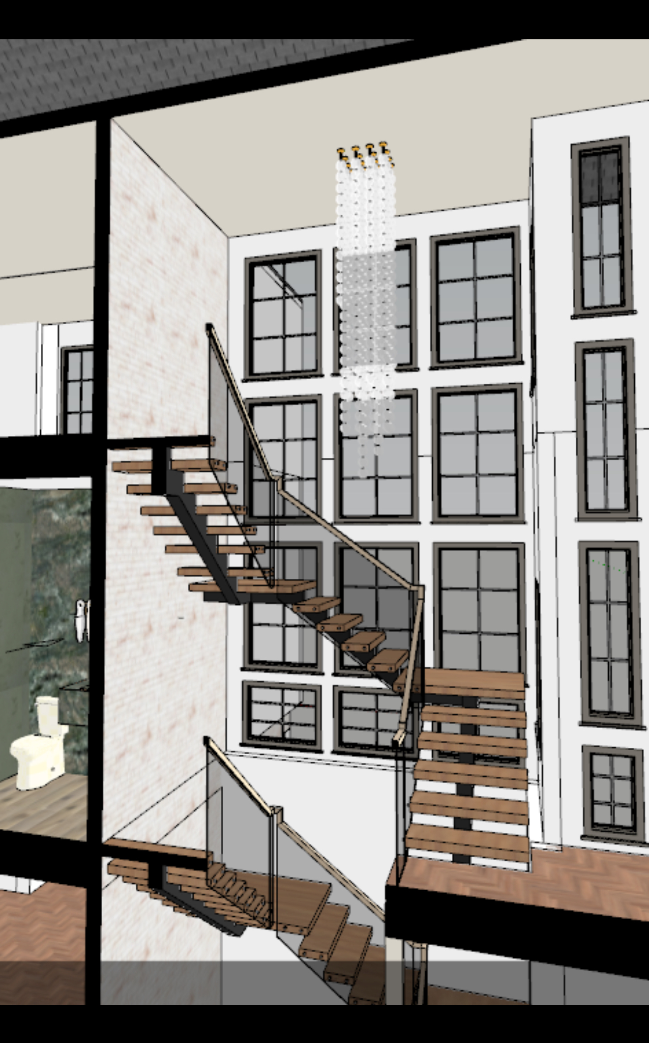 make relistic and make brick wall whiter and show less red brick and make floors white oak and make railing have glass and make railings black and the floor more white for the white oak