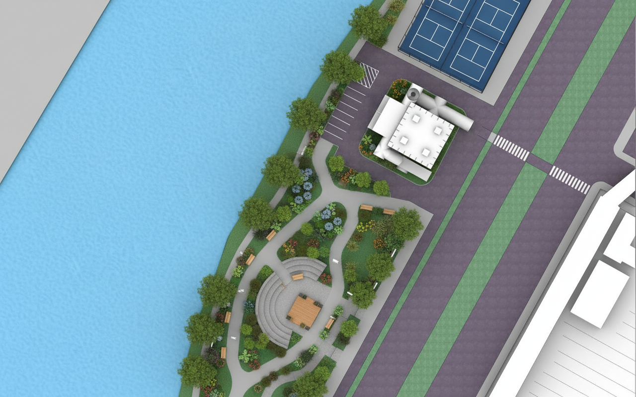 do not change any of the existing geometry except for the following remove the gray triangle in the top left corner and replace it with more of the light blue water add railroad tracks centered on all the angled lines in the bottom right corner move the pickleball courts up the street more and then move the parking lot to its place