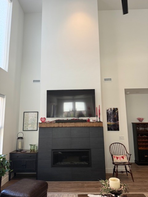 show me this elevation keeping the same fireplace and black tile surround but on the sides doing built ins a standard base cabinet with a drawer 33 on each side and then 3 floating shelves doing in a mid tone brown wood color