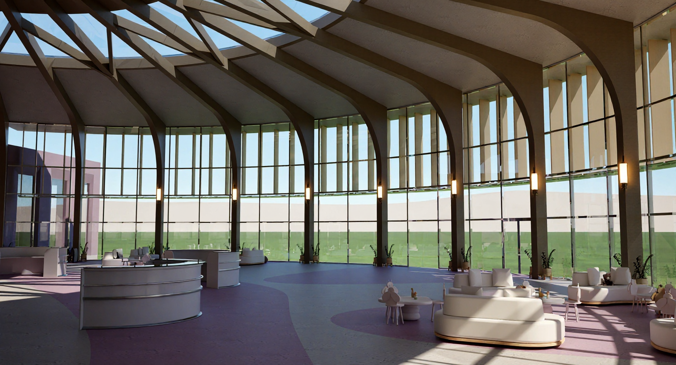 sustainable design exterior shot circled arch with thin columns materials are corten steel and wood ther are also curtains do not add nothing just render what you see with 100 accuracy all on same level architecture