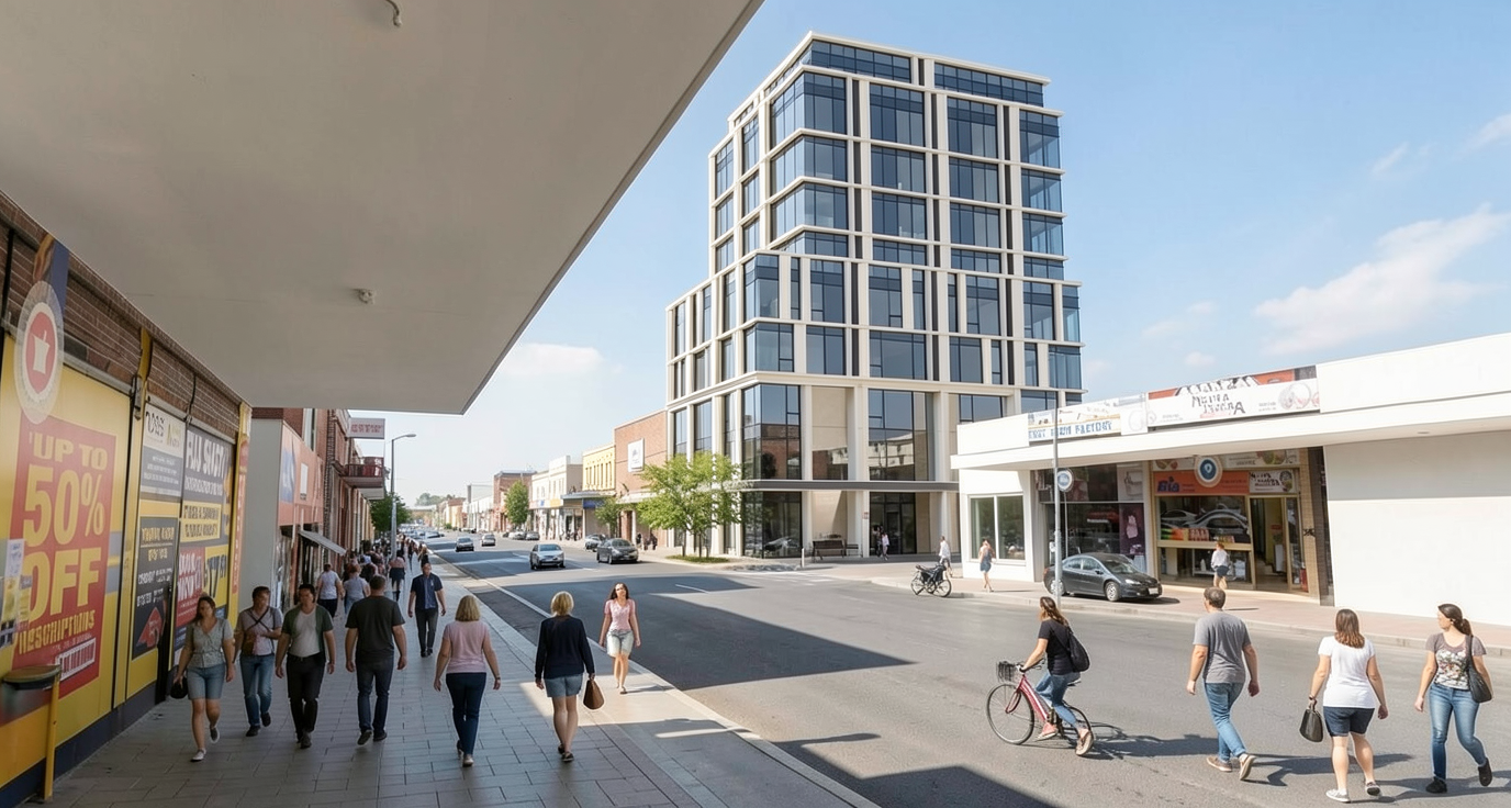 contemporary service apartment building with curtain wall glazing off white frame cladding with black glass color on facade people walking outside in the afternoon