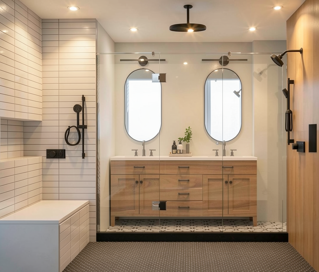 keep everything exactly the same in the rendering do not change the layout walls doors windows shower niche plumbing fixtures wall tile lighting vanity or any materials only add the tile shown in the image to the floor and all walls use the exact tile on the image shown have them going vertically the long way the tiles are large 16x48 make the tiles larges and vertically long keep everything else exactly the same make the final image look like a realistic photo rendering with natural lighting and soft shadows
