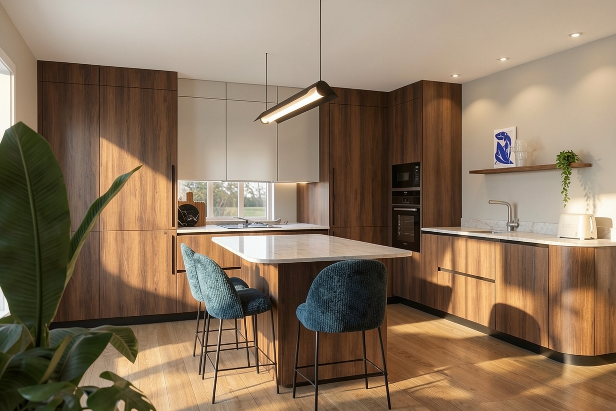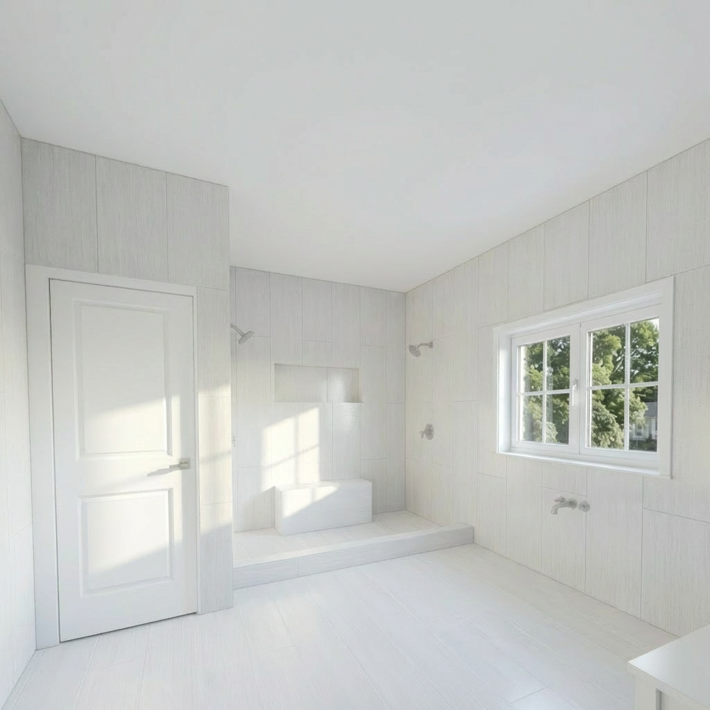 keep everything exactly the same in the rendering do not change the layout walls doors windows shower niche plumbing fixtures wall tile lighting vanity or any materials only change the floor tile size have it match the size on the of the wall tiles so make the floor tiles wider not longer do not change the tile material color layout keep everything else exactly the same make the final image look like a realistic photo rendering with natural lighting and soft shadows