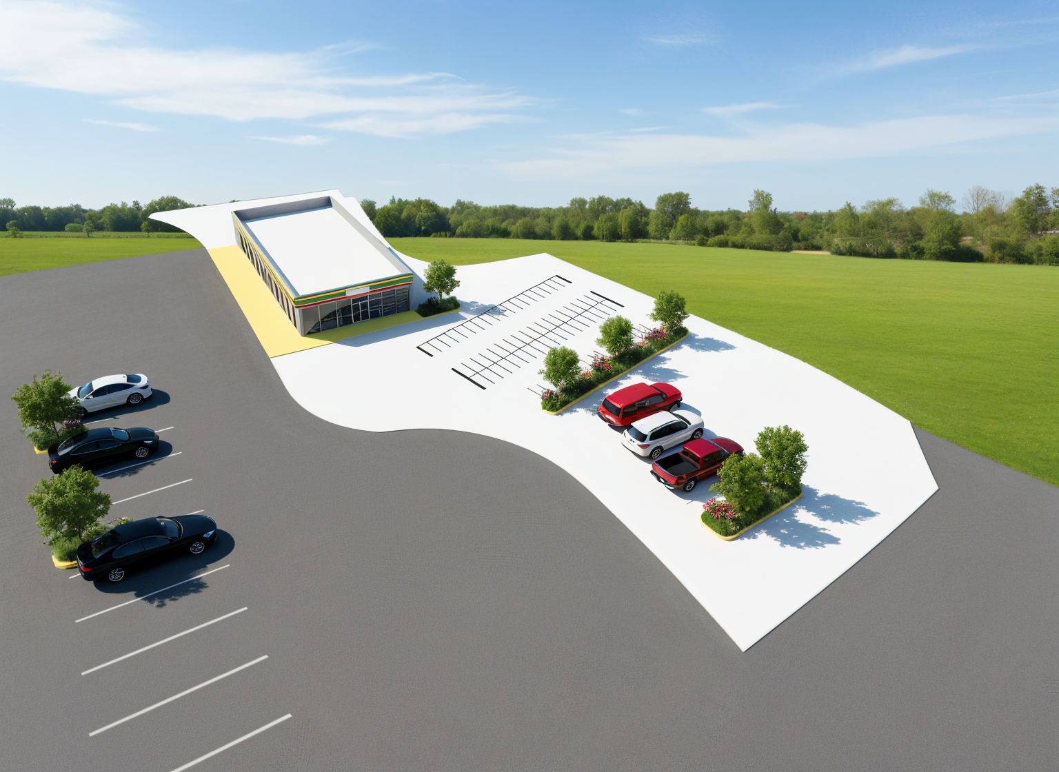 parking lot in front of the store add a few cars sunny weather blue sky slightly overcast small trees in the background in some distancnce in the background flat green areas