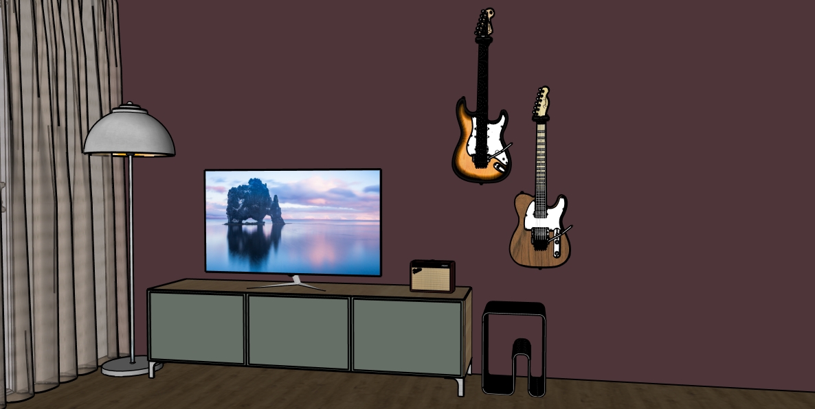 render a stylish modern living room with a cozy warm atmosphere the wall is painted a sophisticated deep mauve on the wall two electric guitars hang one with a sunburst finish and another with a natural wood finish below them a modern entertainment unit in muted sage green supports a sleek flat screen tv displaying a serene seascape at sunset a small vintage style amplifier sits beside the tv a contemporary floor lamp with a metallic silver finish stands gracefully on the floor casting a soft inviting glow elegant sheer curtains in a subtle taupe color adorn a side window and the wooden floor is a rich walnut brown adding warmth to the space