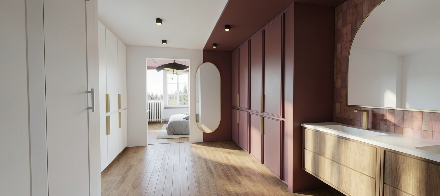 late afternoon light turn on one single wall light fire on and led strip lighting on underneath the shelving