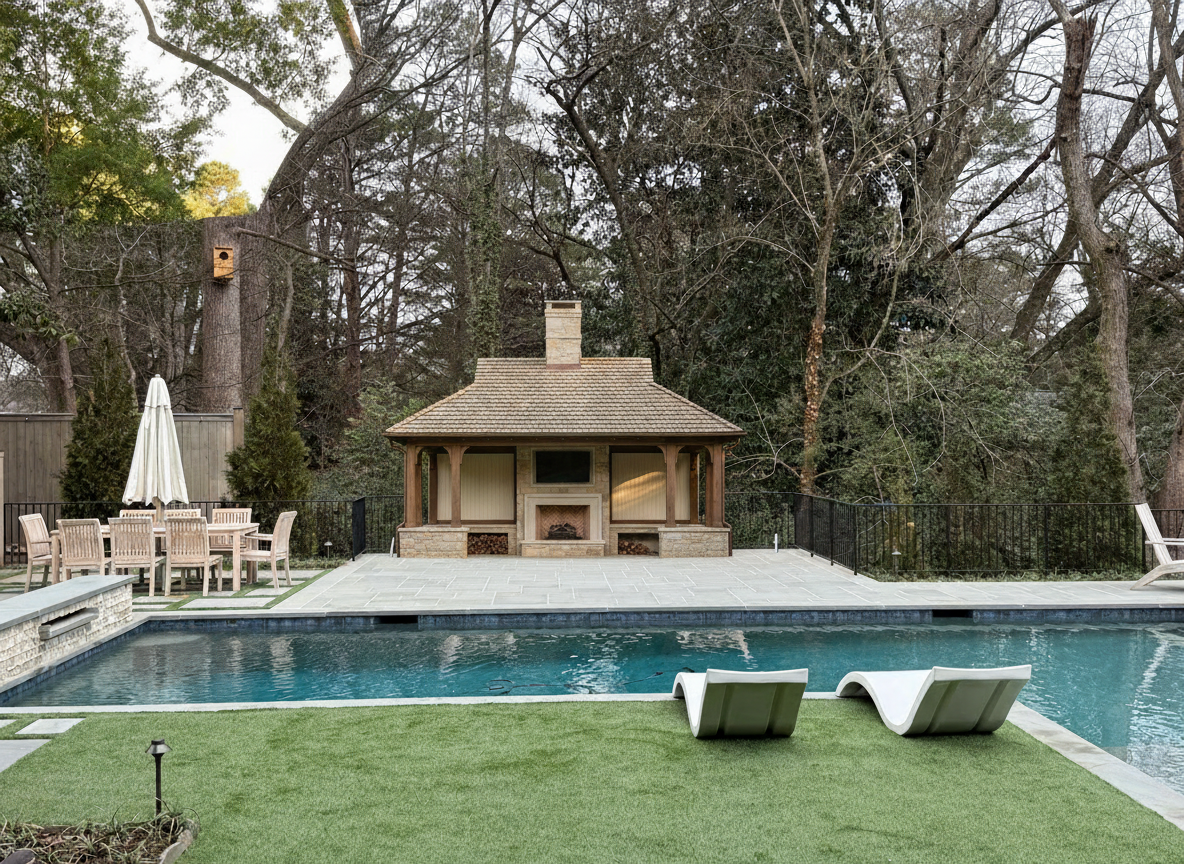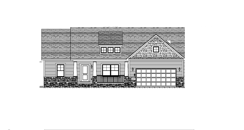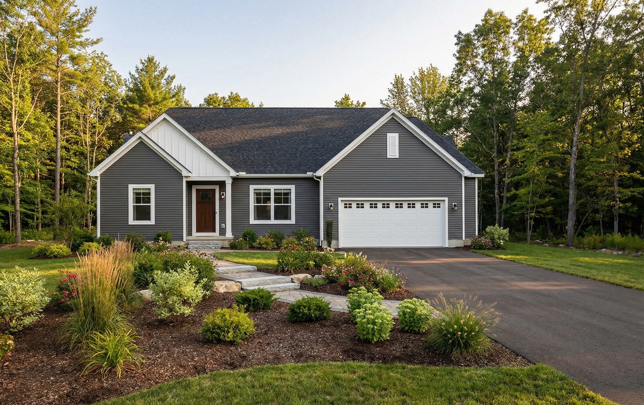 copy prompt make as photorealistic as possible while keeping textures the same as selection professional landscaping in a lightly wooded scene with good lighting white siding per plan buff color stone as shown on the plan dark roof black white windows solid black front door