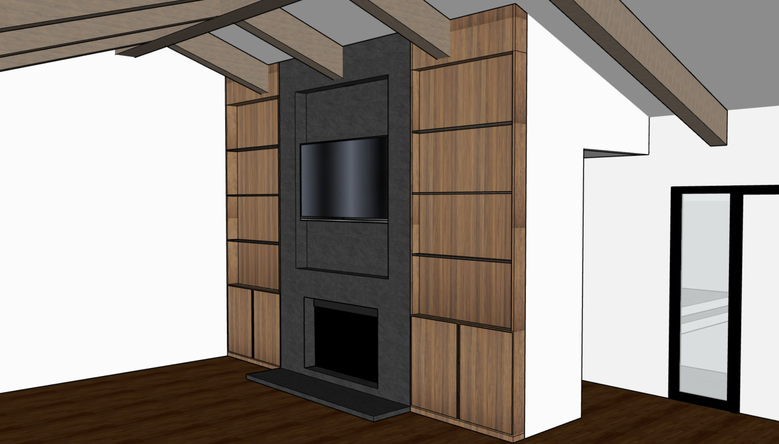 create a beautifully rendered image of a modern living room wall the central feature is a minimalist concrete fireplace in a smooth dark gray tone above it a sleek ultra thin black tv surrounding this a wall of built in shelves crafted from glass and ceiling beams are painted to match cabinets complementing the earthy wooden tones the floor below is dark polished mahogany adding elegance the overall atmosphere is cozy and sophisticated with a warm inviting feel