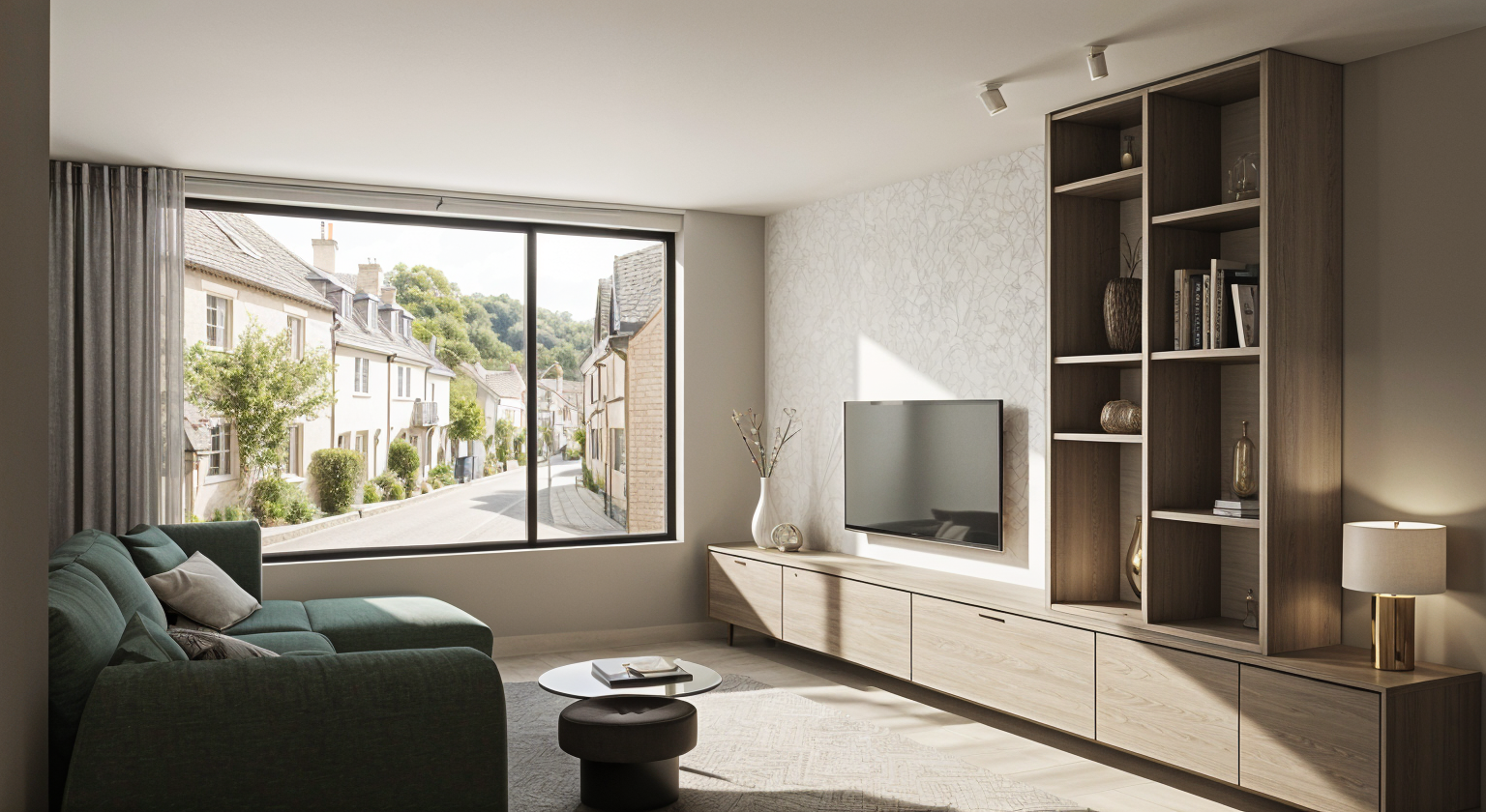 a cozy cafe interior inspired by grandmama s style blending modern and ethnic design soft pastel color palette with sage green cream beige and light blue tones kilim inspired geometric patterned ceramic tiles on the floor muted colors not red dominant natural wood furniture vintage chairs warm lighting nostalgic grandmother house feeling decorative elements like textiles handmade ceramics and subtle ethnic details bright airy welcoming atmosphere high end interior design realistic 3d render soft shadows natural light ultra detailed