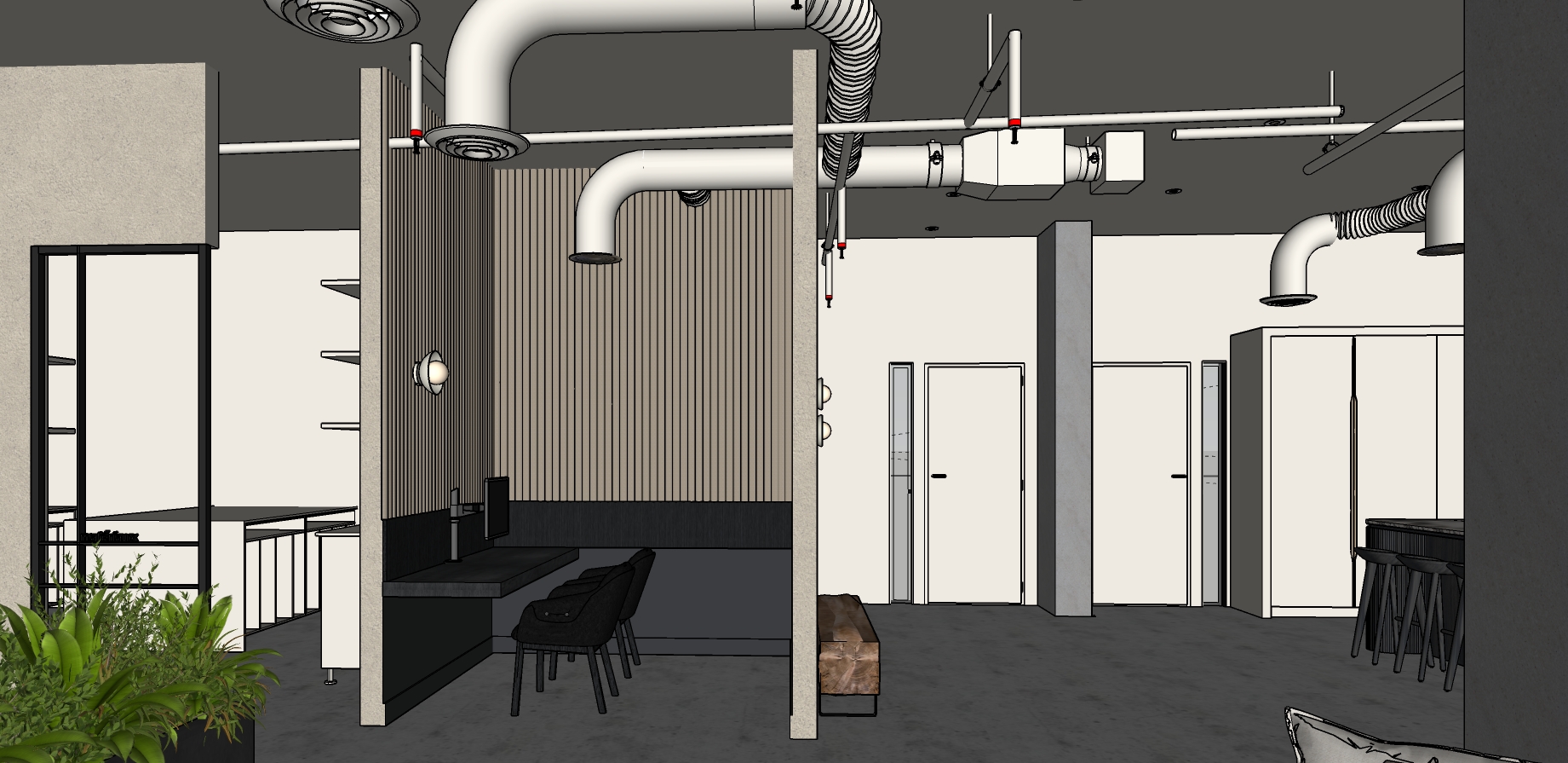 faire un rendu photorealiste avec de la lumiere du jour conserver tous les materiaux tels qu ils le sont sur l image de base les demi ronds de feutres acoustiques au mur dans le phone booth uniquement en partie haute la ou il y a le beige du bois noir pour la petite tabblette et le bas du mur fonc comme sur l image de base le reste des murs est blanc les portes et cadres de portes sont blancs les colonnes et le planchers sont en beton l appliqwue murale est une applique de chez luminaire authentik la danoise murale en beige ne rien modifier de l image de base