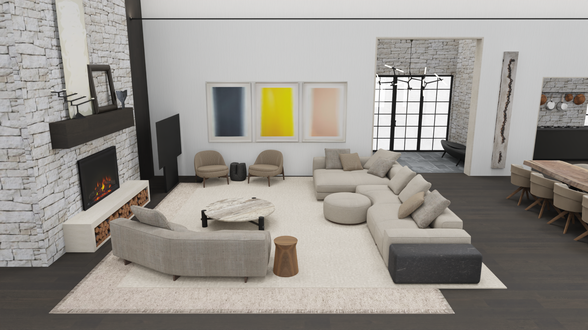 a luxurious modern living room with an open layout warm floor to ceiling taupe curtains frame the windows complementing the soft beige sectional sofa the stone fireplace made of white and light grey bricks serves as a focal point a sleek dark wood mantel atop the fireplace is adorned with minimalist decor the room has a neutral color palette with a pop of color from abstract wall art featuring navy blue vibrant yellow and soft peach a marble coffee table with black legs sits centrally on a plush beige carpet the flooring is a rich dark wood adding depth to the room the atmosphere is warm and inviting perfect for relaxation and socializing