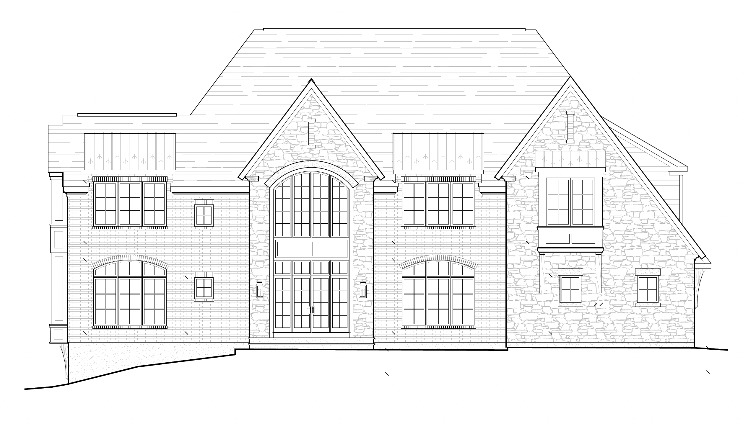 render the provided front elevation as a flat 2d architectural elevation no perspective no shadows no camera angle changes maintain all proportions window sizes rooflines and architectural details exactly as drawn materials and colors windows andersen black exterior front entry door sidelights transom black metal brick and stone sherwin williams alabaster light warm white tone subtle variation between materials box bays sherwin williams iron ore dark charcoal standing seam metal roofs porch bays black metal main roof asphalt shingles tamko rustic black trim match sw alabaster rendering style clean high end architectural presentation subtle realistic material textures no exaggerated contrast even lighting no dramatic shadows keep linework crisp and consistent with original drawing no landscaping no background no added elements important constraints do not modify design proportions or window configurations do not introduce perspective or 3d depth do not change roof pitches or overhangs do not reinterpret materials apply exactly as specified