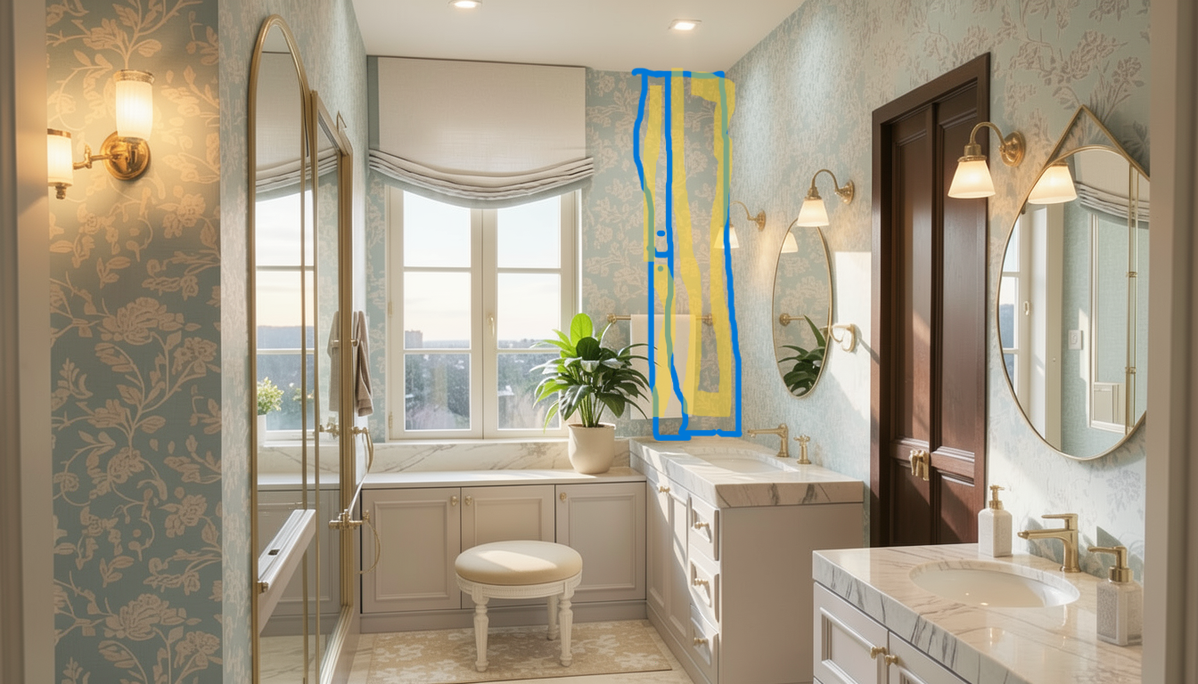 add a tall countertop linen cabinet to the back right corner of the vanity