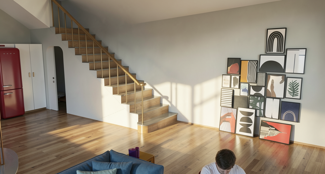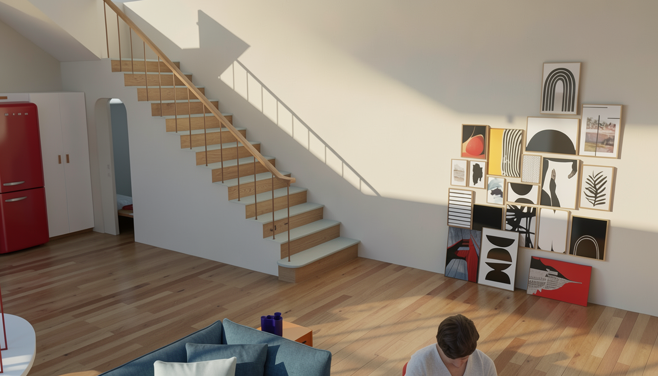 create a 3d realistic interior moderne style colored keeping the floor