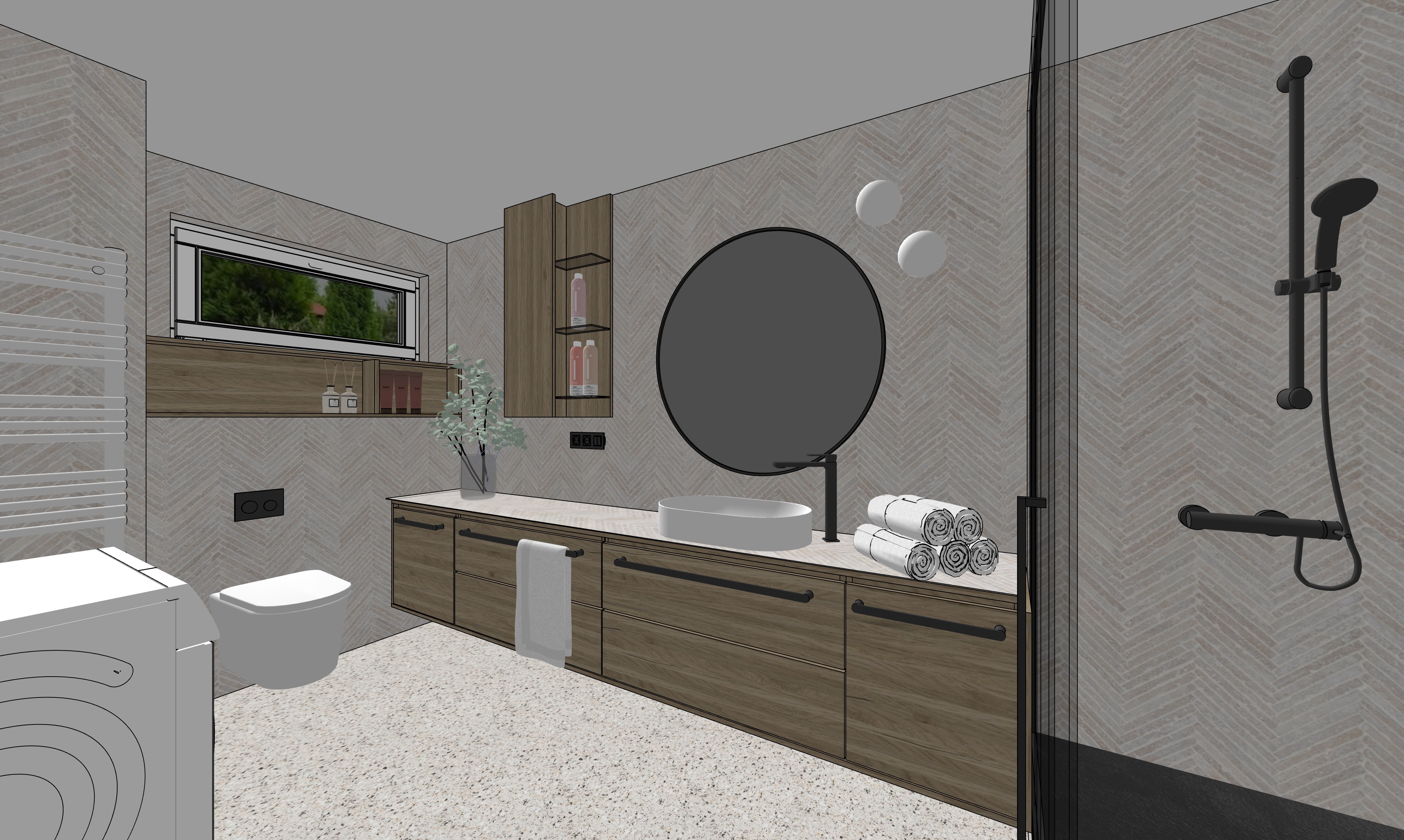 create a photorealistic interior photograph based strictly on the provided design visualization preserve the exact layout proportions furniture placement colors and all design elements without any changes or additions this is a realism enhancement task not a redesign use high quality natural materials with realistic textures wood fabrics matte surfaces and accurate detailing improve material realism while keeping original colors and finishes lighting should be soft natural daylight with subtle shadows creating a warm inviting atmosphere use balanced exposure realistic highlights and no overexposed areas add gentle ambient light for depth maintaining a cozy and harmonious mood camera should mimic a professional interior photography shot eye level perspective 24 35mm lens equivalent sharp focus high dynamic range and natural depth ensure high resolution clean composition no distortion no added objects and no stylistic reinterpretation the result should look like a real photograph of the exact designed space make soft scandinavian style lighting warm neutral color balance ultra realistic materials and textures the floor is made of fine terrazzo there are small soft towels rolled up to the right of the sink