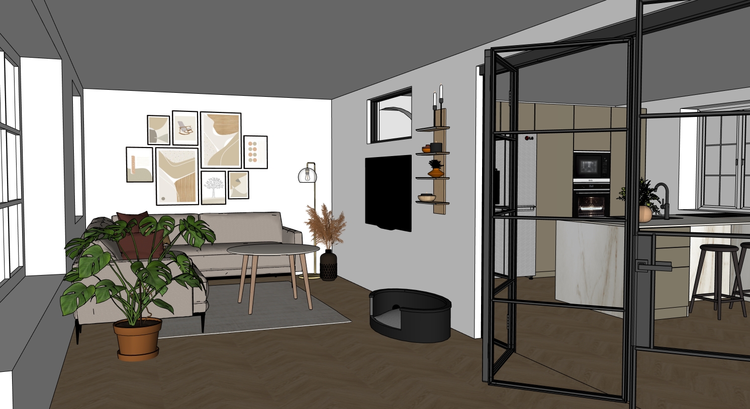 create a beautifully rendered modern livingroom with a cozy atmosphere use a neutral muted palette the walls in white and the trim in crisp white add a light oak herringbone wood floor incorporate a sleek glass partition with black metal framing design a minimalistic kitchen with high gloss dark brown cabinets and a stainless steel fridge add warm toned pillows on the distant sofa and abstract wall art with beige taupe and terracotta accents enhance the ambiance with soft natural lighting add a natural lightning in the kitchen