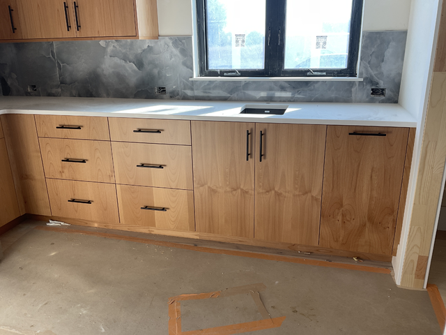 do not change the cabinets in any way preserve the exact cabinet colors materials finishes dimensions door and drawer styles hardware spacing alignment and all geometry exactly as shown do not alter the countertop shape backsplash appliances flooring lighting fixtures or wall structure only remove the construction materials clutter and mess from the scene clean the room and make it look finished and staged add a few simple tasteful home accessories appropriate for the style of the space but do not add or remove any furniture windows or architectural elements maintain the original lighting direction and realism enhance clarity and polish the photo while keeping the cabinetry and room design completely unchanged do not alter the lighting to keep the cabinet colors as they are in the image add new flooring faucet put a simple view out the window cover the holes in the backsplash stage the countertop for a kitchen