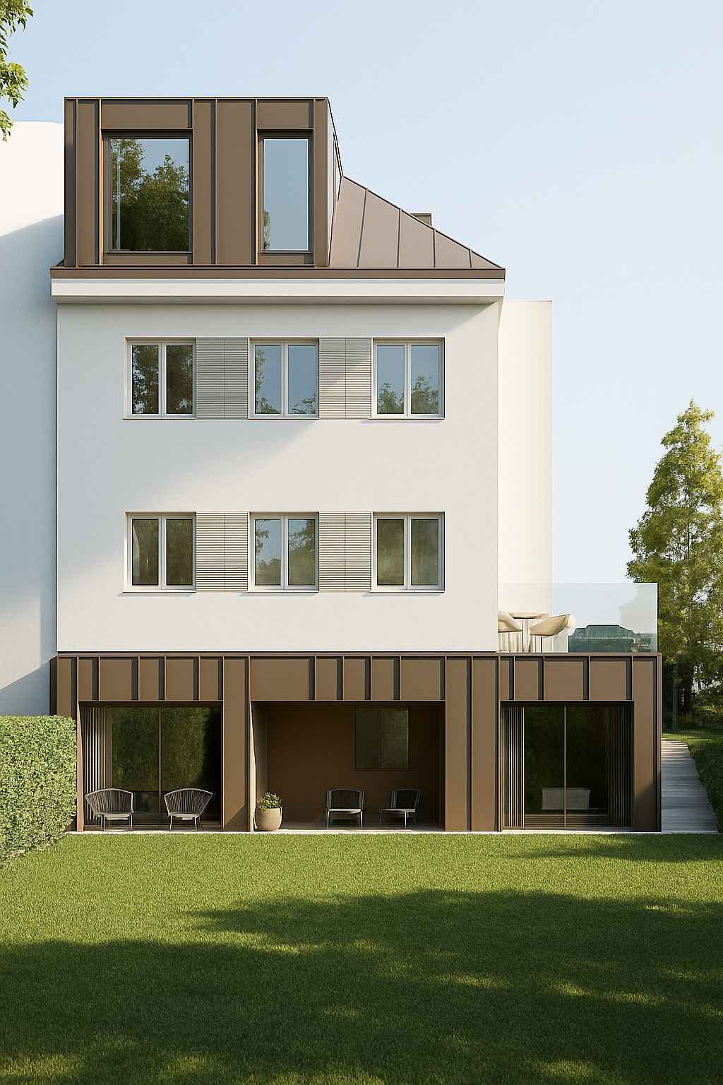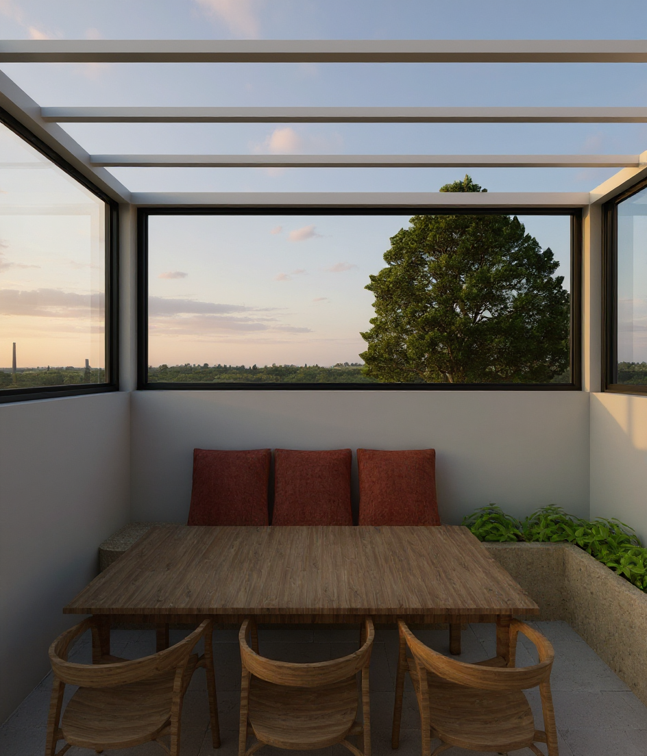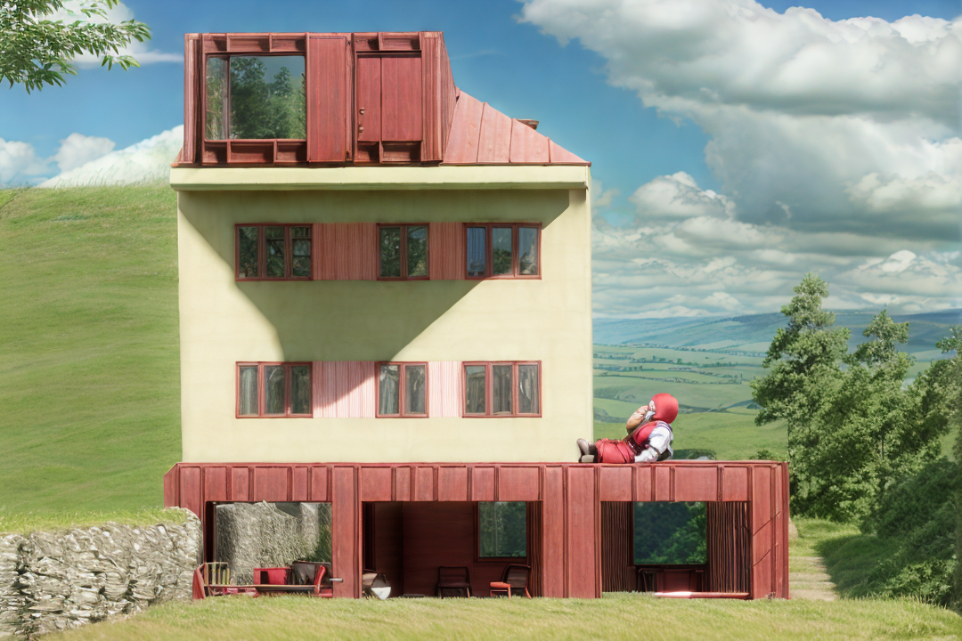 render this house to have nice natural lightning the weather is sunny put some cups of coffee on the table