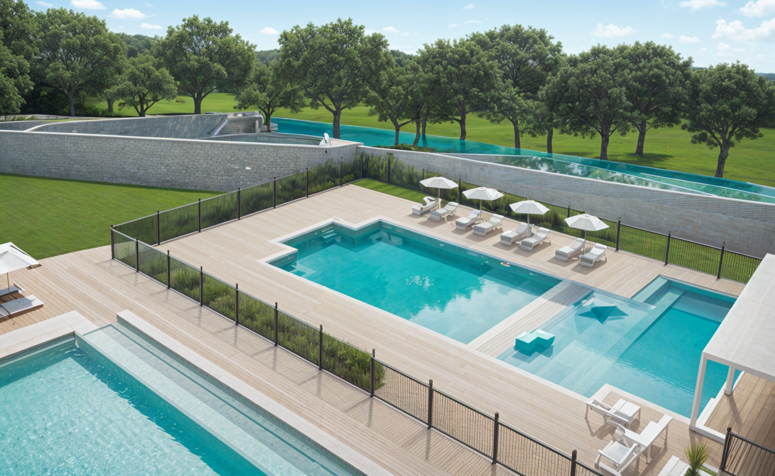 exterior shot render community pool setting landscaping surrounds the pool next to a metal fence the pool deck is concrete outside of the pool is a slope that is heavily forested at the bottom of the slope is a river there is a fire pit at the top of the slope before the trees that overlooks the slope and river architecture