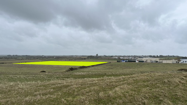 add eight rows of ground mounted solar arraysinside the area highlighted yellow rotate panels to face building on the right keep original image proportions
