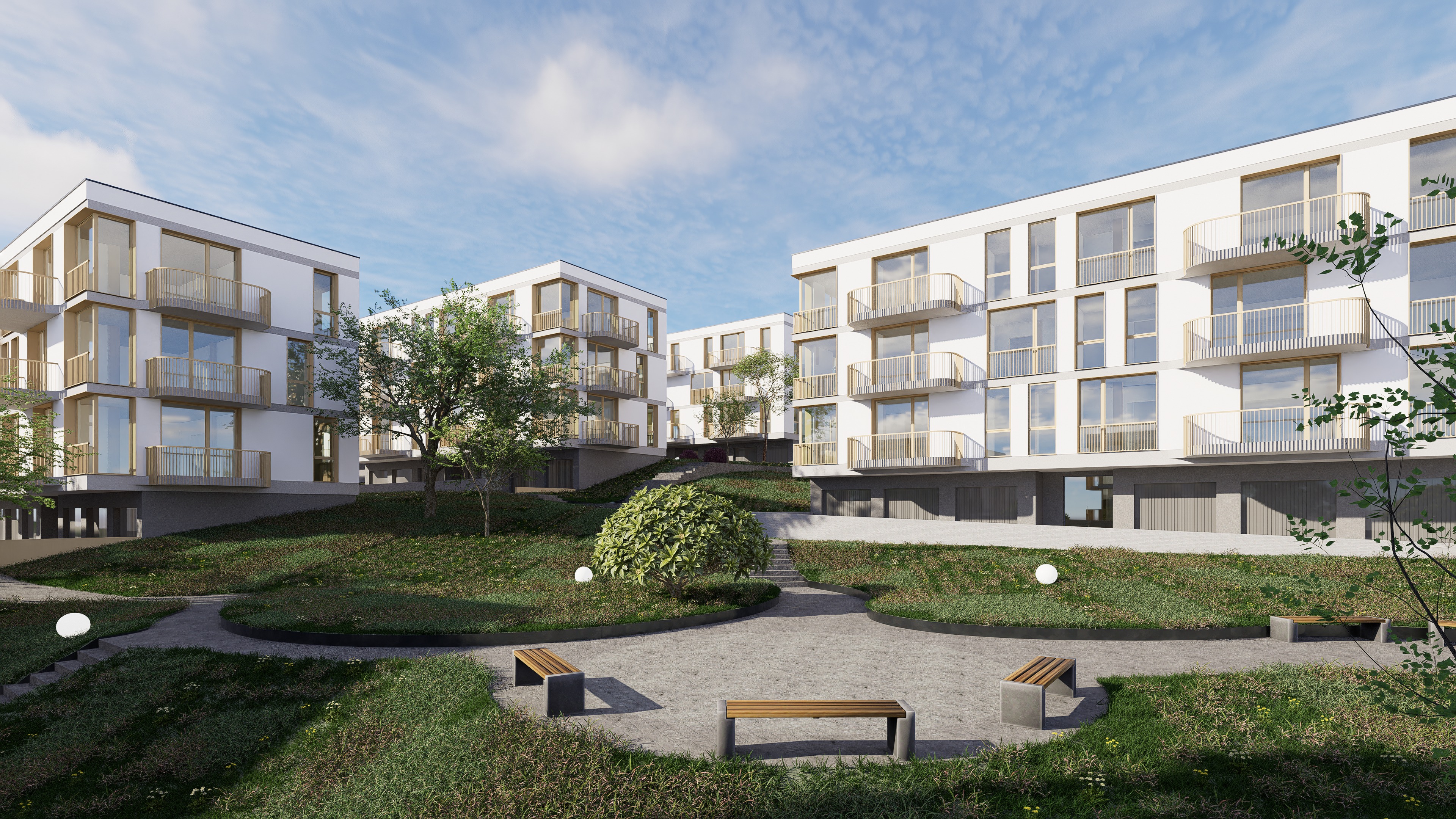 important preserve the existing geometry and the existing context exactly as provided do not modify alter reinterpret add remove scale or reshape any geometry do not change the site surroundings street layout neighboring buildings vegetation or context elements do not modify geometry scale proportions buildings road layout sidewalks or surrounding context in any way do not change text photorealistic architectural rendering clean and balanced contrast calm cinematic mood style contemporary european residential architecture minimalist premium understated include people subtle motion blur for realism do not add new peopledo not change the green spacedo not change the sidewalkdo not change the roadadd reflection of the sorroundings to the windowsremove the peopleremove the wet asphalt
