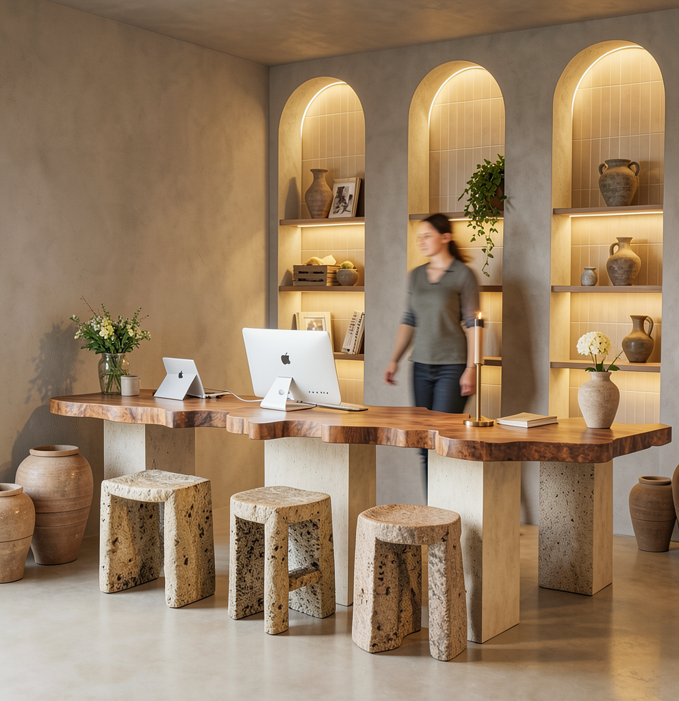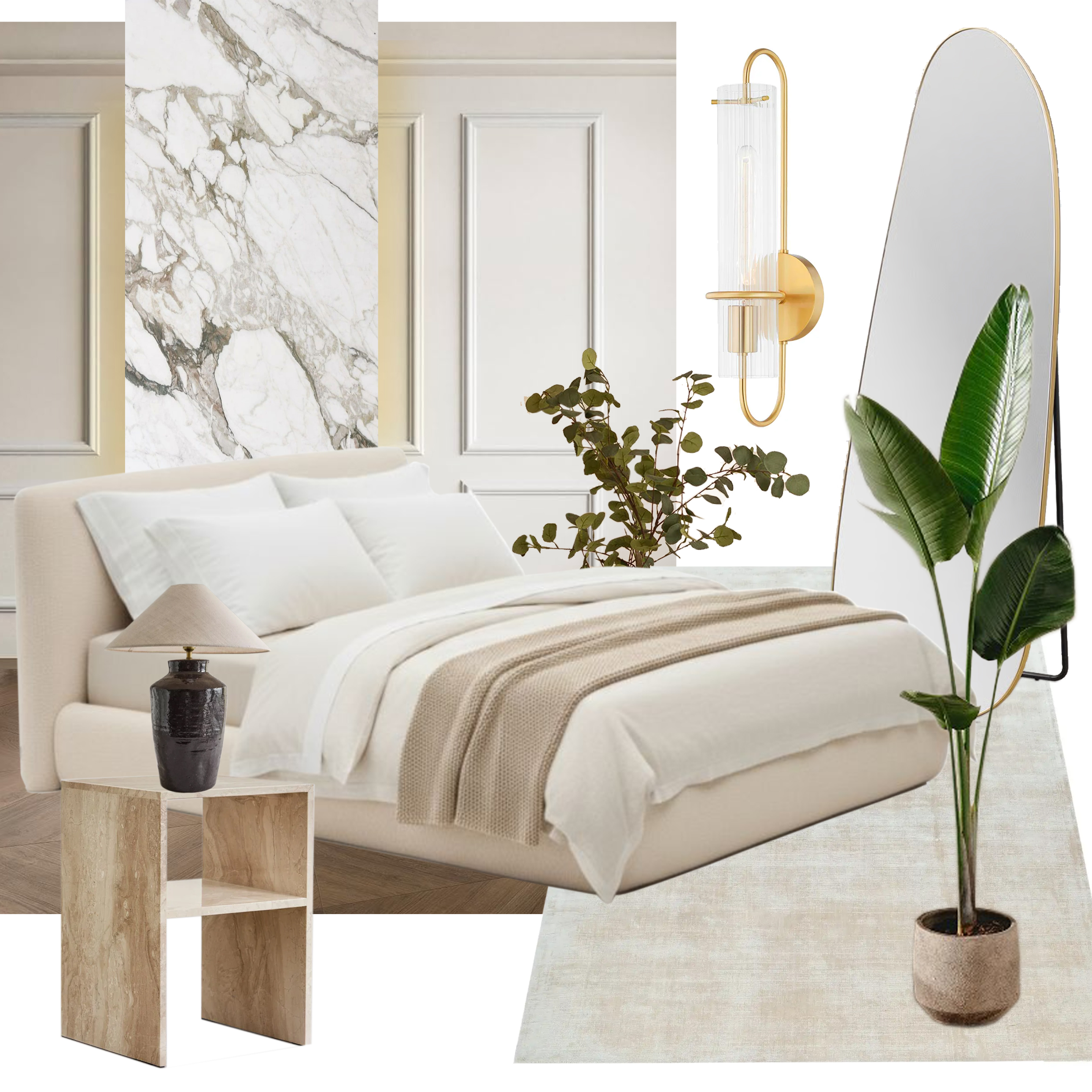 exterior shot cozy modern bedroom opening to a serene patio walls and ceiling are soft beige creating a warm atmosphere the bed has an elegant dark grey headboard with plush white pillows and a light taupe bedding the floor is a soft neutral tone large glass doors lead to a tranquil patio with lush green plants and a clear blue sky two comfortable brown cushioned chairs surround a sleek white table the overall ambiance is peaceful and inviting with natural light illuminating the space